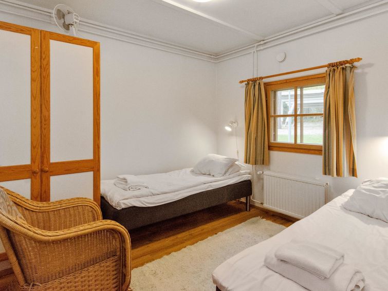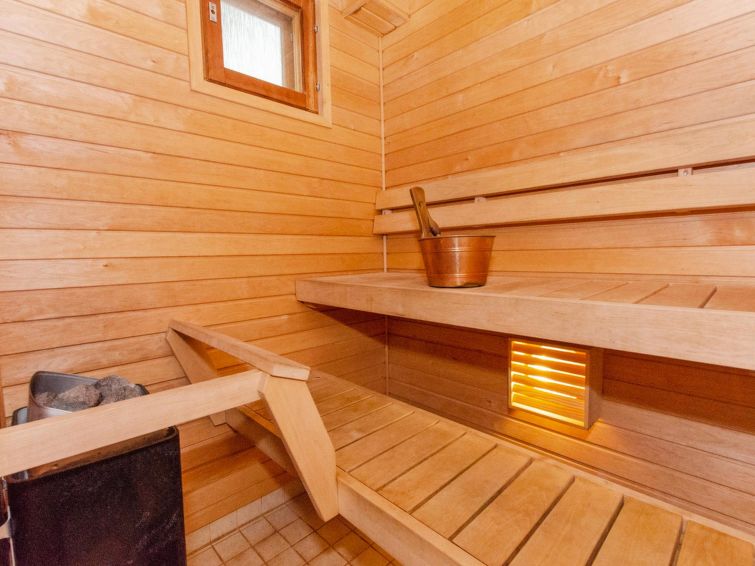 The apartment has a living room/kitchen, 2 bedrooms, one with a double bed and the other with 2 beds. In addition, there is an electric sauna, bathroom, WC, and a terrace with a table and chairs for 4 people.