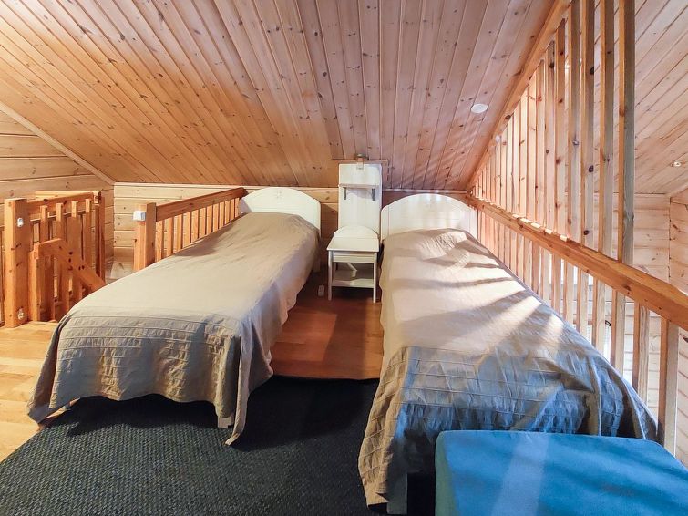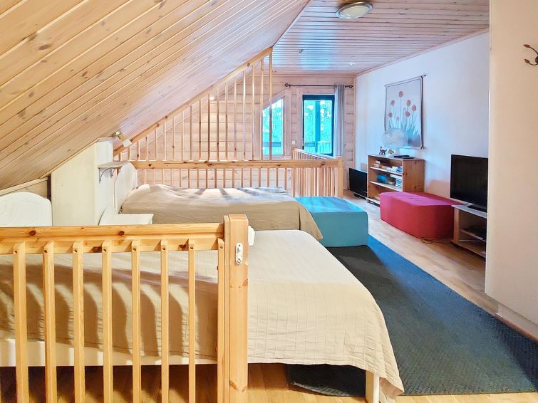 Semidetached log home from 2007, living room/kitchen, bedroom with double bed, washing room (2 showers), dressing room, WC, sauna (electric stove) terrace, upstairs bedroom with 2 beds, hall with 2 beds, TV and WC. A shared washing machine is located in the basement floor, access from outside. A neat and cosy apartment in a quiet cottage area on the shore of Lake Syväri. The apartment is well suited for two small families and couples, pets are also welcome.