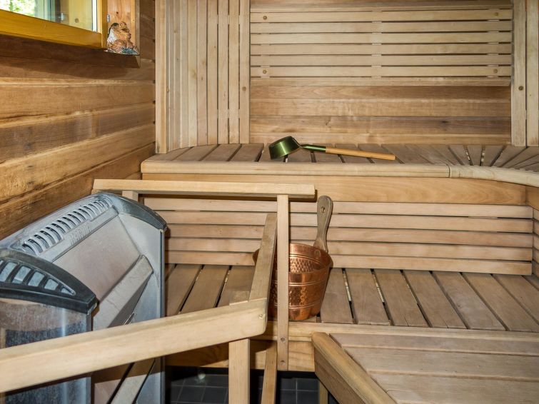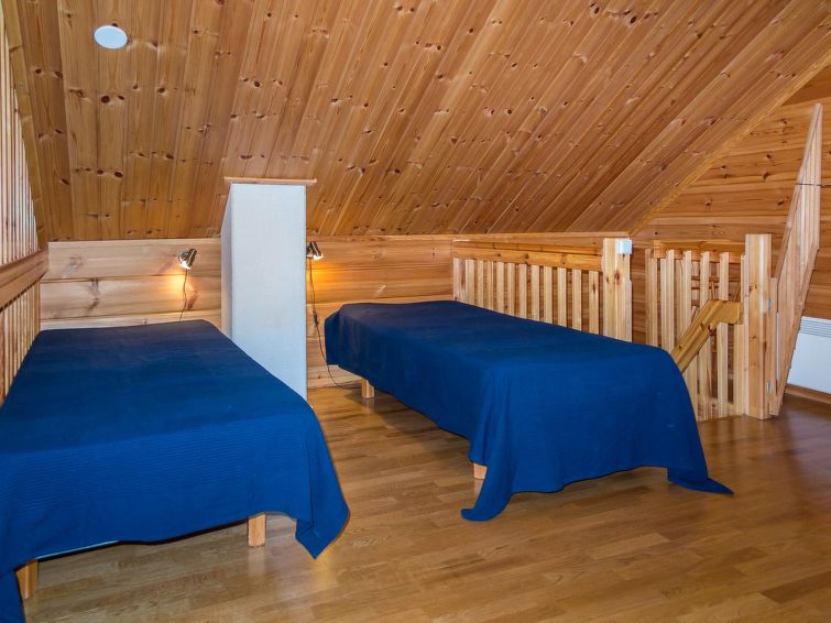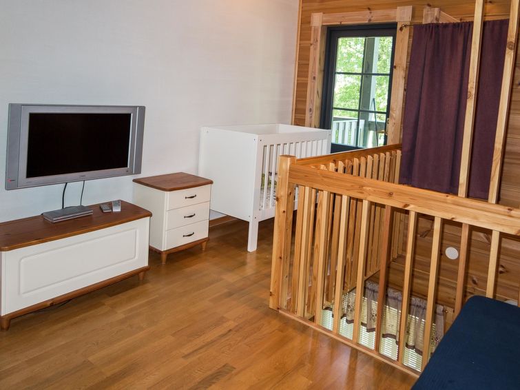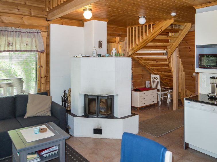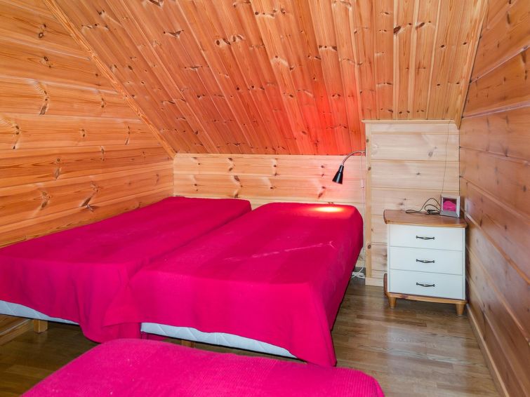 Semidetached log home from 2007, living room/kitchen with sofa-bed for 1 person, bedroom with double bed, washing room, dressing room, WC, sauna (electric stove) terrace, upstairs bedroom with 2 separate beds +1 child bed, hall with 2 beds, TV and WC. A shared washing machine is located in the basement floor, access from outside. A neat and cosy apartment in a cottage area on the shore of Lake Syväri. The apartment is well suited for two small families and couples, pets are also welcome.