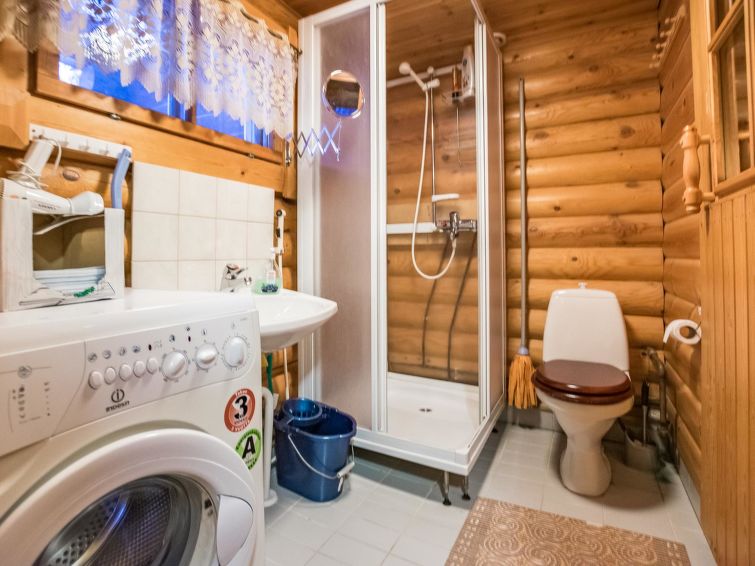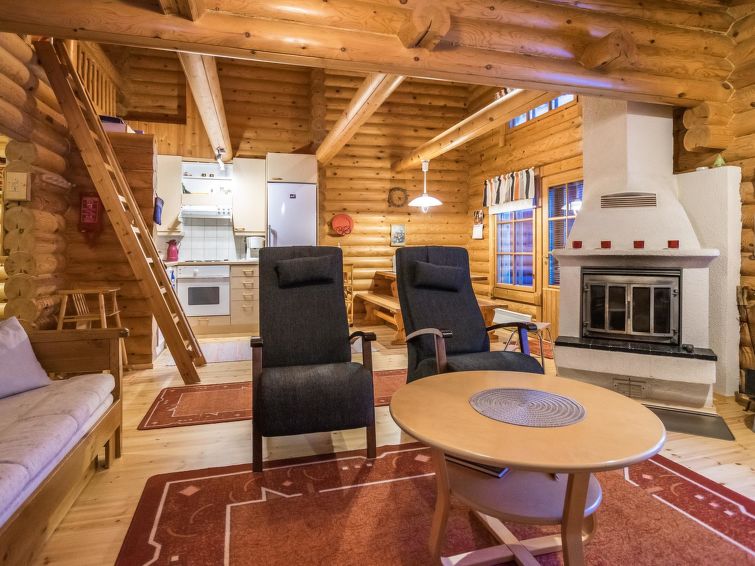 Bedroom with a double bed, living room with a sofa bed and kitchenette; sauna with adjoining dressing room, WC, attic (steep stairs) with 3 mattresses.