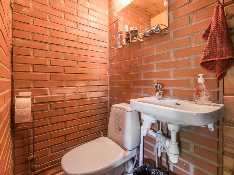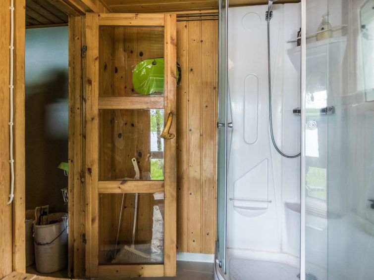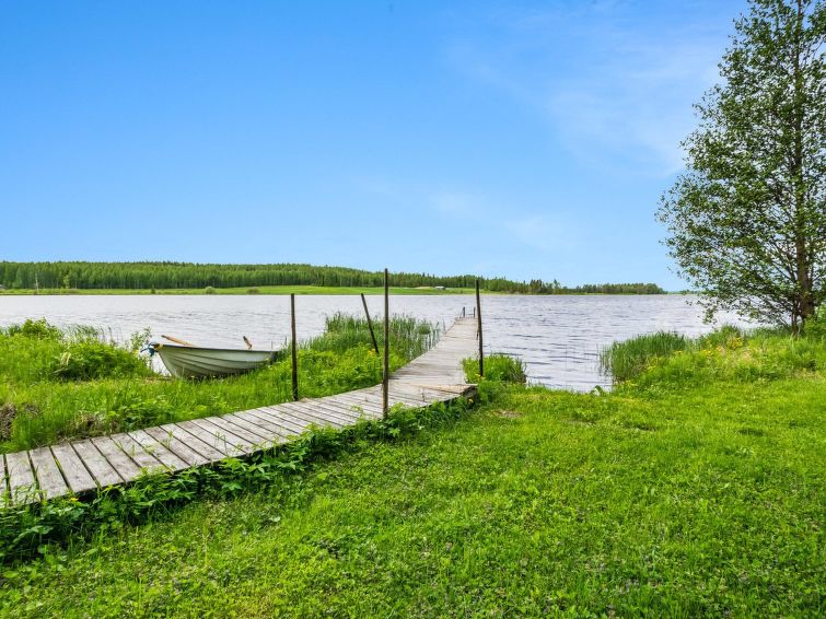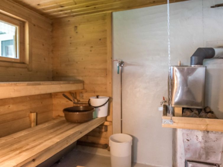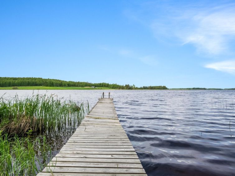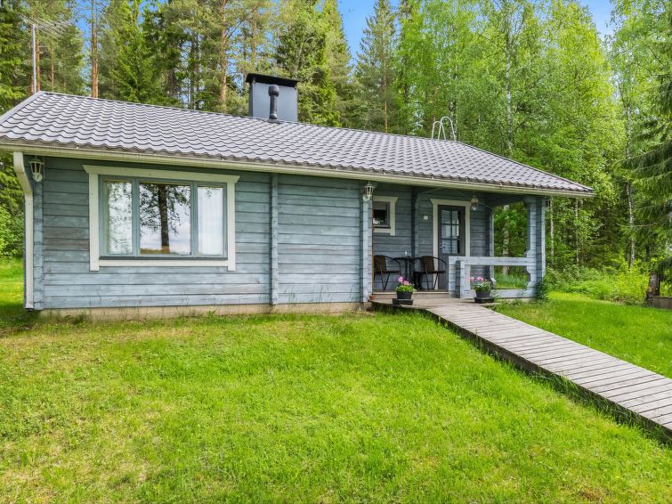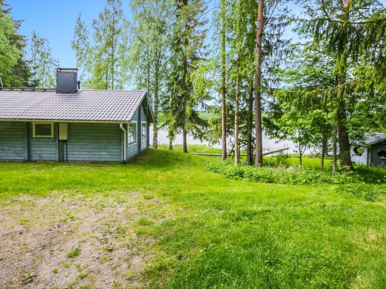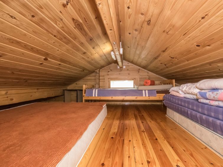 60 km north of Kuopio, L. Onkivesi 15 m (length 35 km, width ab. 5 km), shallow, hard sand bottom, boat. Log cottage 1998, renovated 2010, living room/kitchen with convertible sofa/double bed (as alternative beds), bedroom with 2 beds, low loft (15 m²) with 1 bed and 3 mattresses (on top of stairs hatch), toilet, entry. Washroom with shower cabinet, sauna and roofed terrace. Access to sauna and washroom through porch. Cottage on gently sloping grassy plot. Steep decline down into yard. Lake view faces south-west, summer kitchen and a long pier on shore. Woodshed and outdoor privy in yard. Yard and shore ideal for families with children.