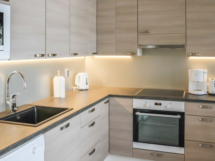 Wooden cabin 2014, living room/kitchen, bedroom (12 m²) two beds, bedroom (10 m²) two beds, sleeping loft (20 m², floor area approx. 40 m²) four beds, dressing room, washroom, sauna, separate WC.