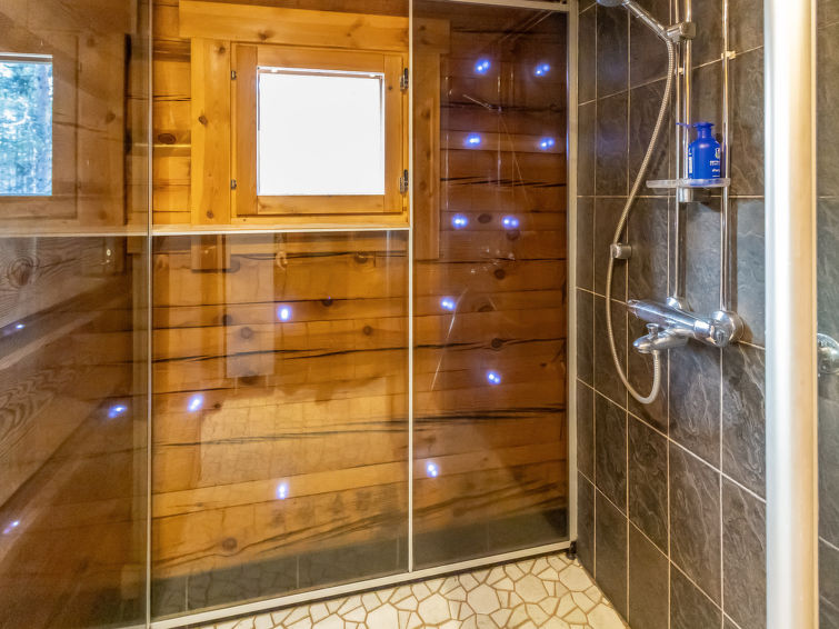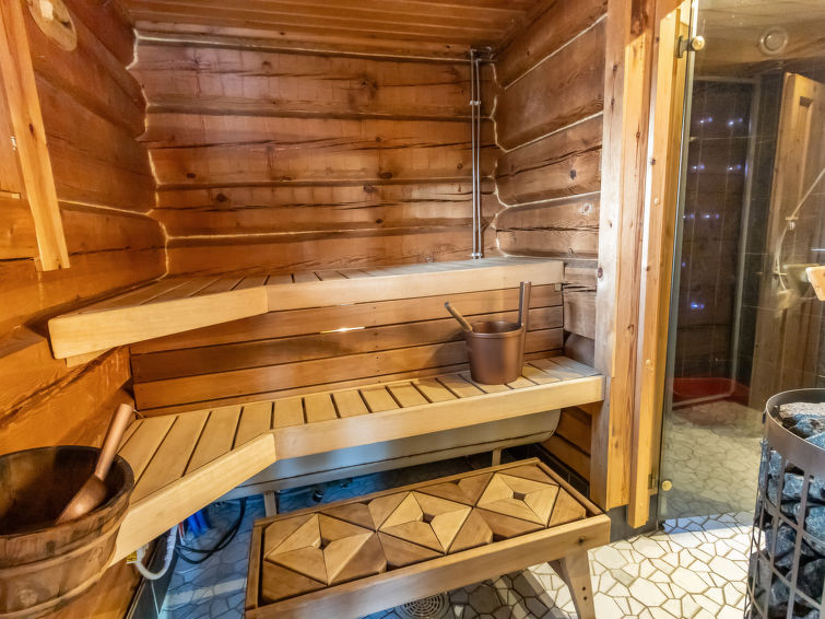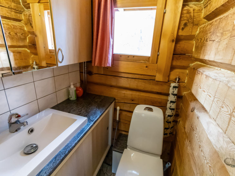 305 km north of Rovaniemi, River Ounasjoki 400 m (path to river bank/shore), own boat and 2 canoes. Log cottage 1993, living room/kitchen, small bedroom with double bed (width 120 cm), sleeping loft 3 beds, sauna (electric stove), washroom, separate WC, heated glazed veranda. A cord of firewood is included. More firewood at extra cost (6e/item).
