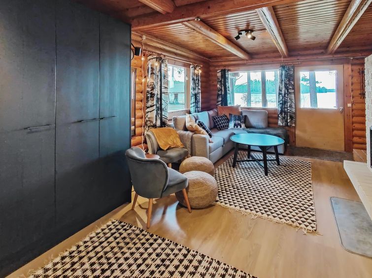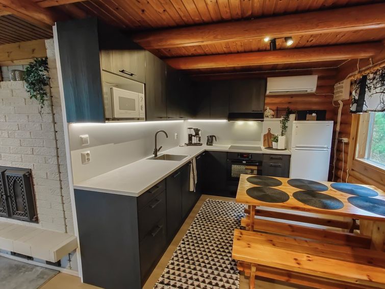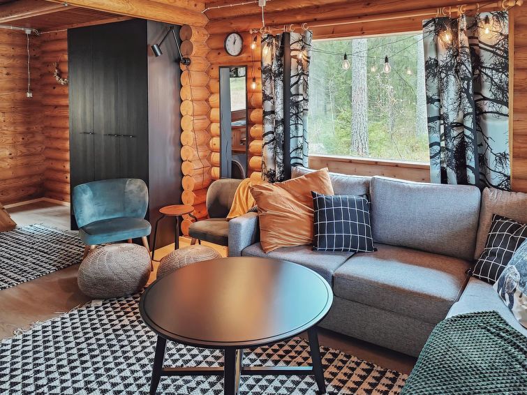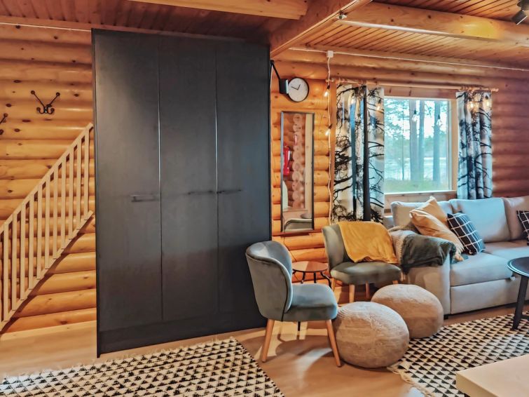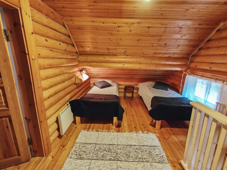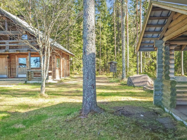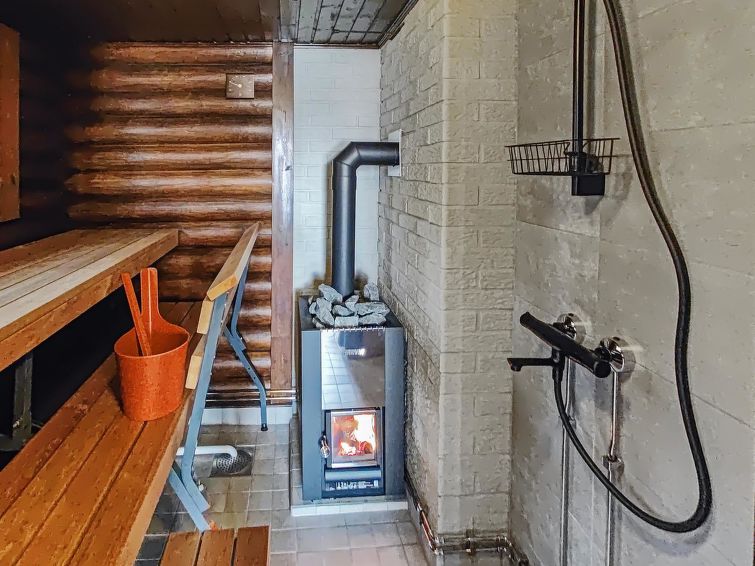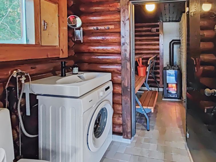 Log cabin 1988, interior renovation done in 2023. Downstairs: living room/kitchen with one bed, toilet-dressing room (access both indoors and outdoors), wood-heated sauna with shower, open veranda.