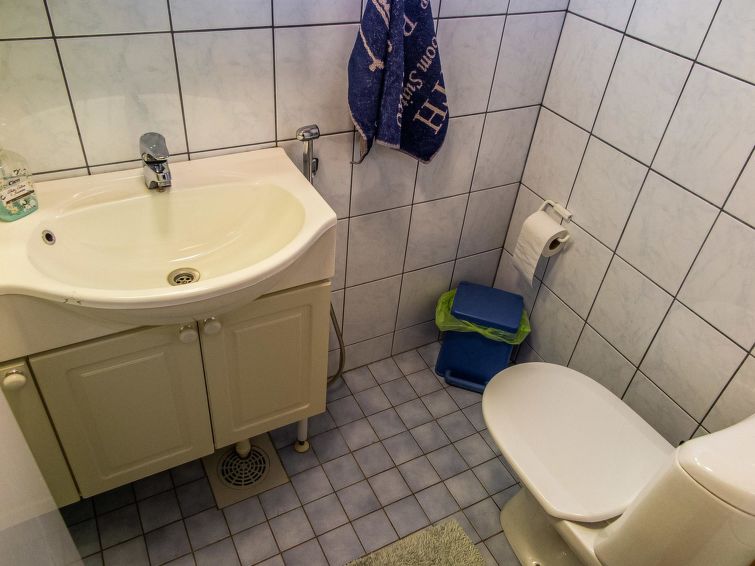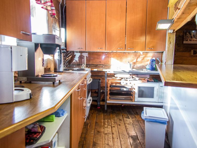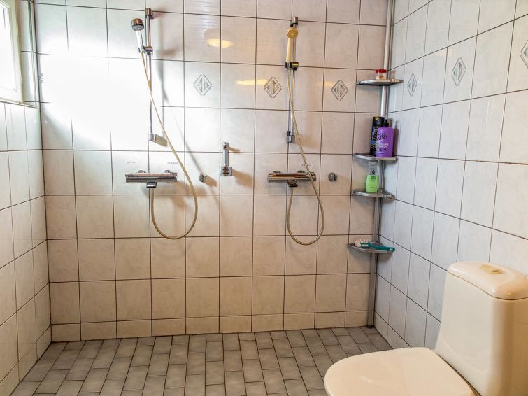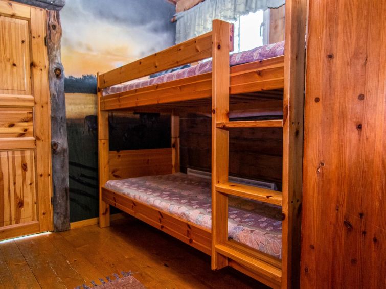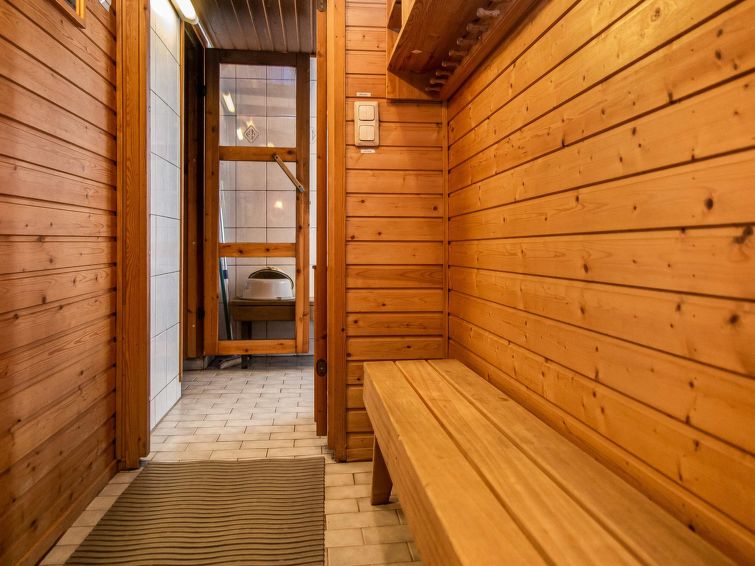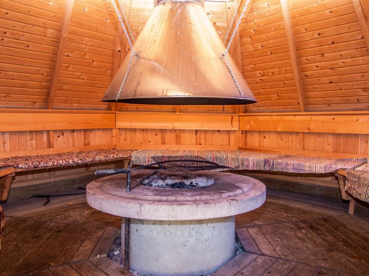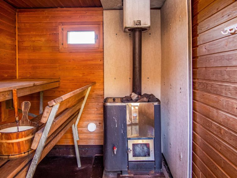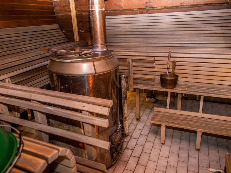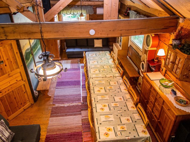 Log cabin 1997, really big living room (approx. 60 sq m), in the center of the living room there is a barbeque area, another living room with bunk bed, 2 sofa beds = 4 extra beds, shallow upstairs sleeping alcove (avg. height 1.7 m) with a double bed, low loft ( avg. height 1.3 m) with a double bed. The washing room with toilet and two showers, also separate toilet, sauna (wood-burning stove).