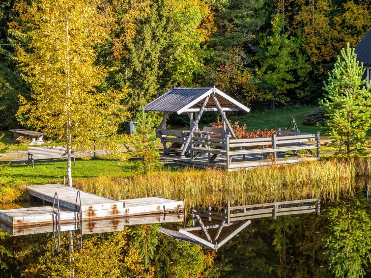 65 km northeast of Kuopio, artificial pond 25 m (size 20 x 30 meters), the deepest point of the pond is 3 meters, deep shore, the water flows through the pond. Artificial pond and dock are shared with neighboring cottage 13344.