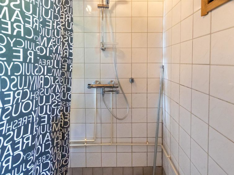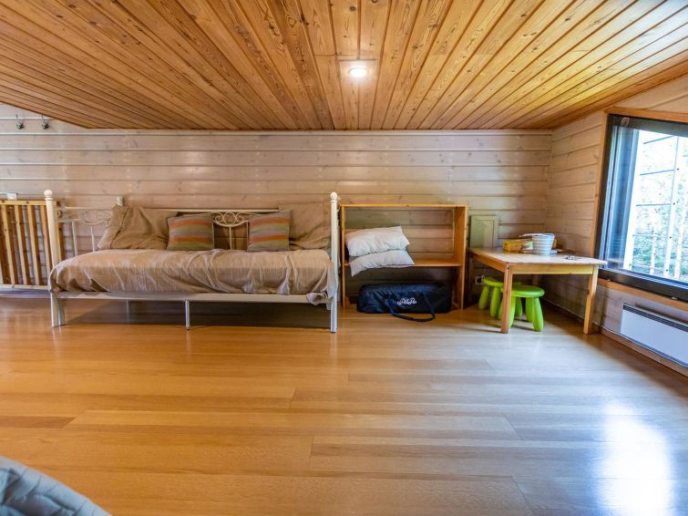 Downstairs there is a kitchen, bedroom and washing facilities. The large loft sleeps a total of four. A fold-out bed and two 80cm frame beds. There is also an old TV and VHS player with cassettes, as well as a drawing corner for children.
