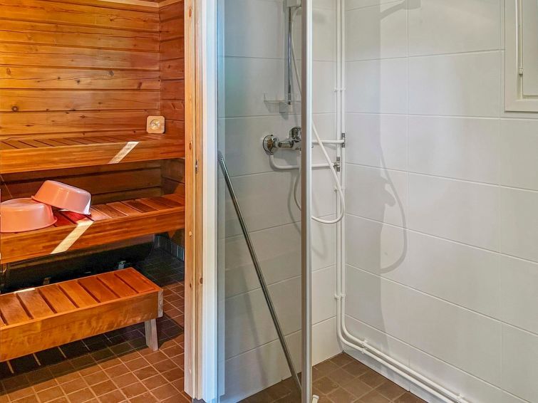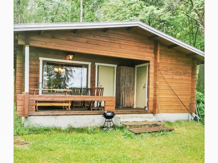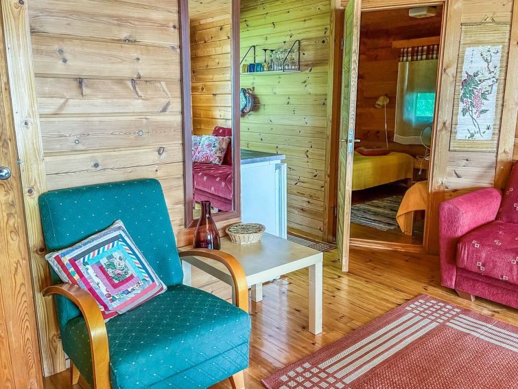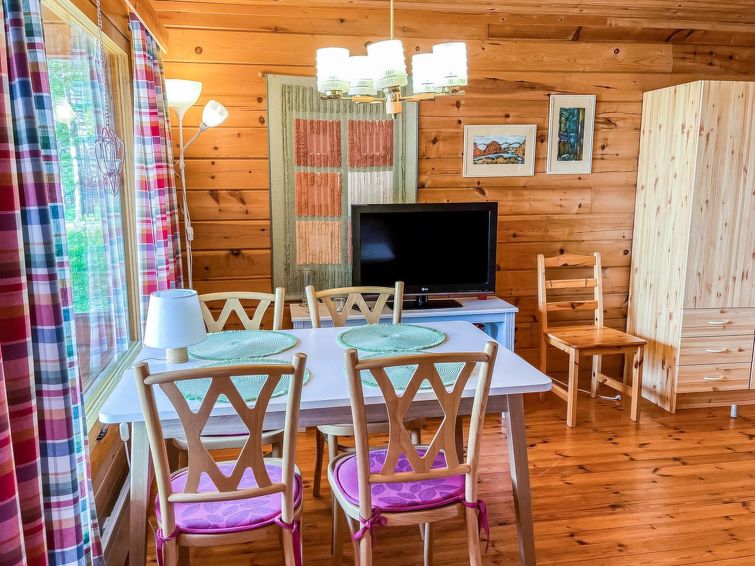 Log cabin 1983, kitchenette (renovated 2021), 2 bedrooms with 2 beds in each, living room with 1 bed, washroom, sauna (electric sauna stove), open veranda. Sauna and washroom renovated 2022. View to the Linnansaari National Park (rinked seal area).