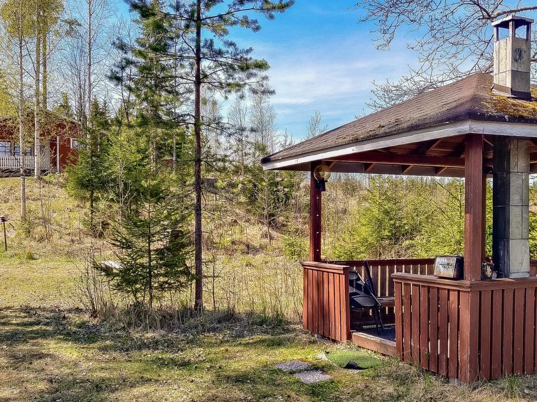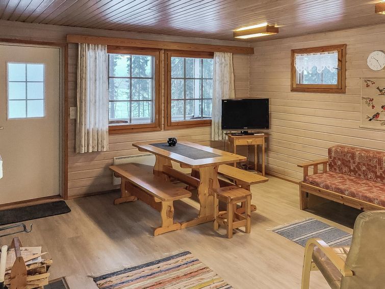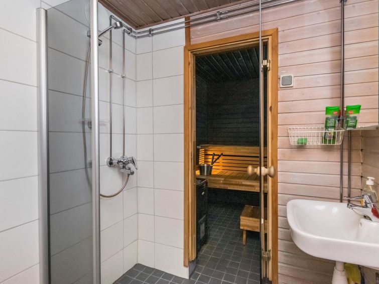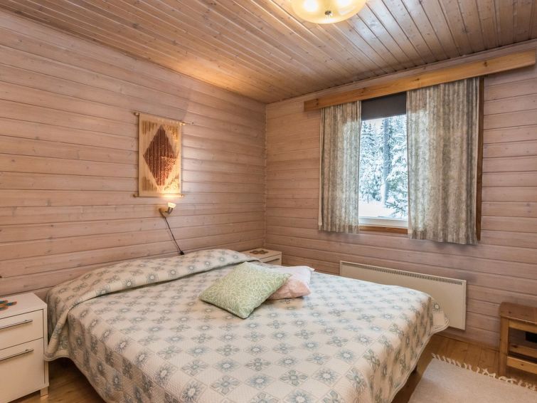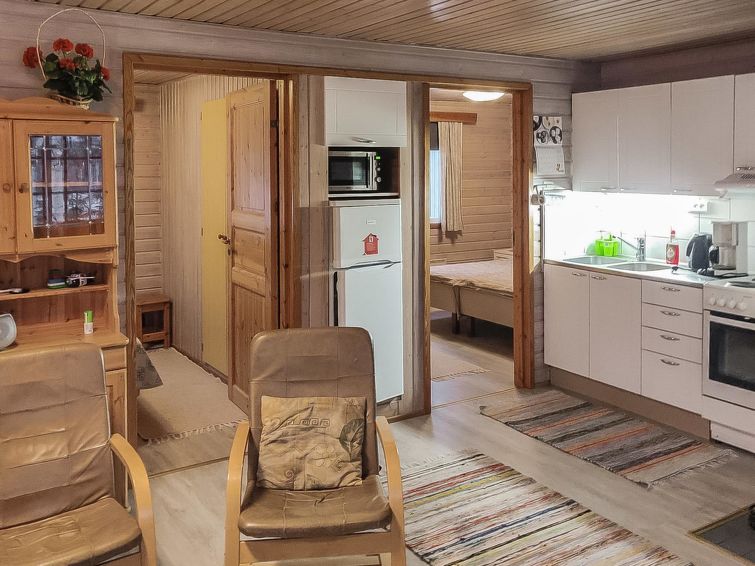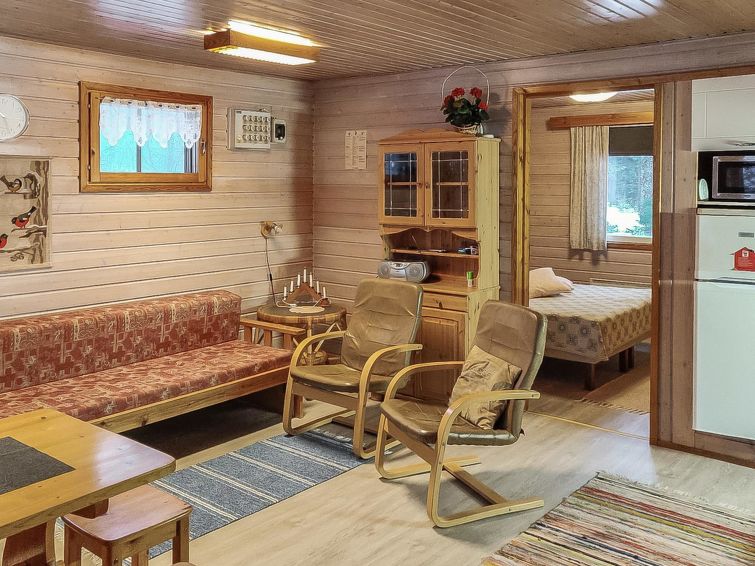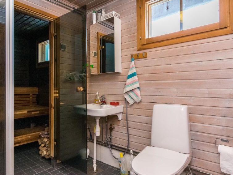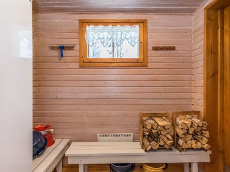 Wooden cottage 1984, partly renovated 2000, living room/kitchen extendable extra double bed, bedroom (8 m²) double bed, bedroom (10 m²) 2 beds, sauna (wood-burning stove), washroom with shower and WC, dressing room with drying cupboard, terrace. Roofed grill. Woodshed/storeroom.