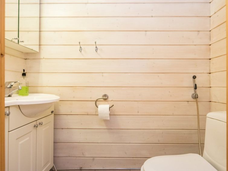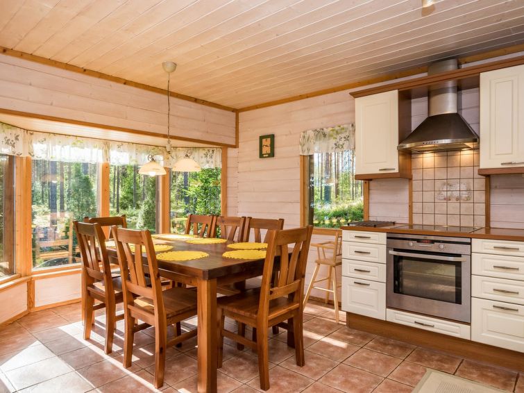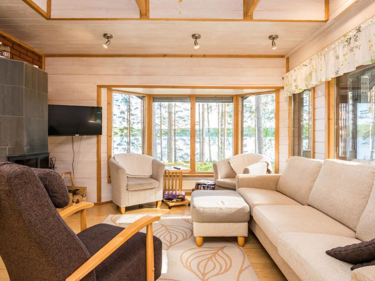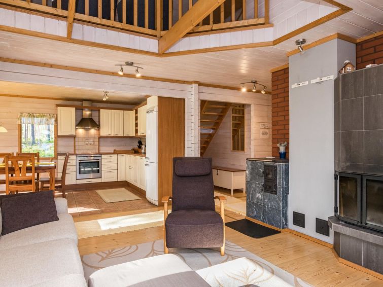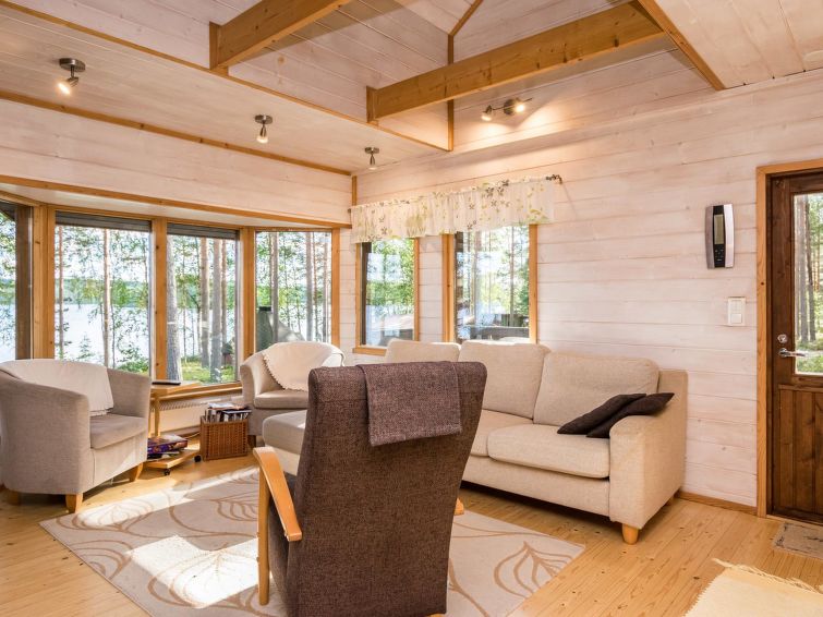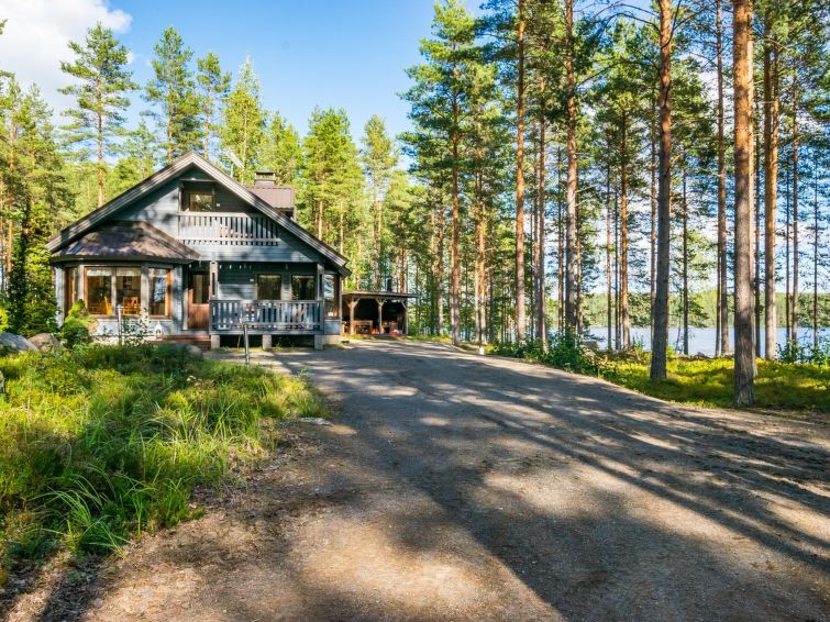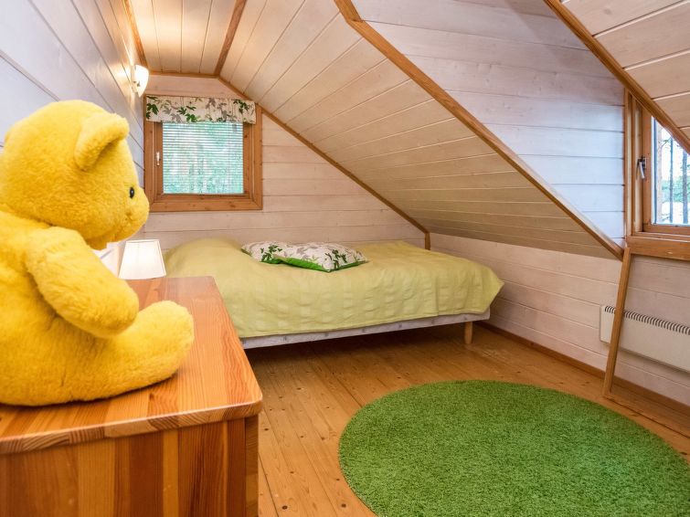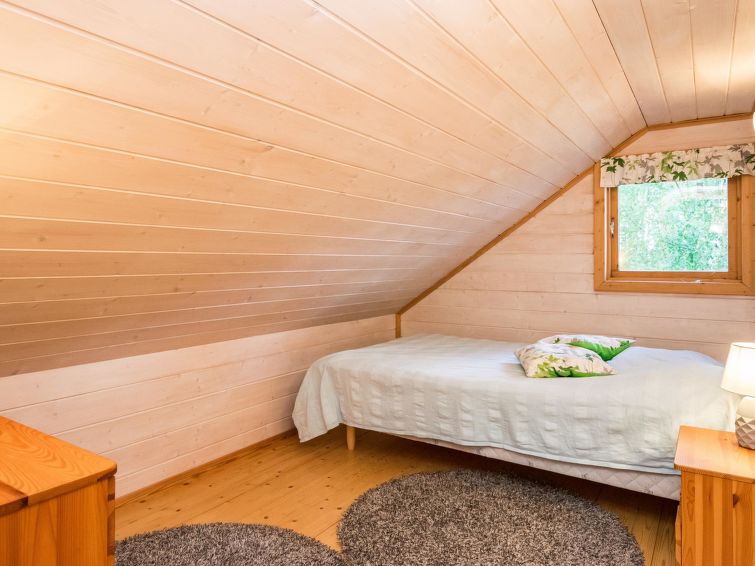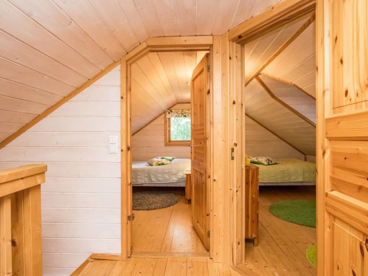 60 km south of Mikkeli, Lake Sarkavesi 30 m (lenght 11 km, breadth 0,5 km), shallow shore, hard sanded bottom, own boat. Log cabin 2007, downstairs: living room, kitchen, bedroom 2 beds. Upstairs: 2 bed rooms 2 bedrooms with 120 cm broad bed in each, tv-hall and a balcony. Sauna with electric stove, dresing room, washroom, open veranda.
