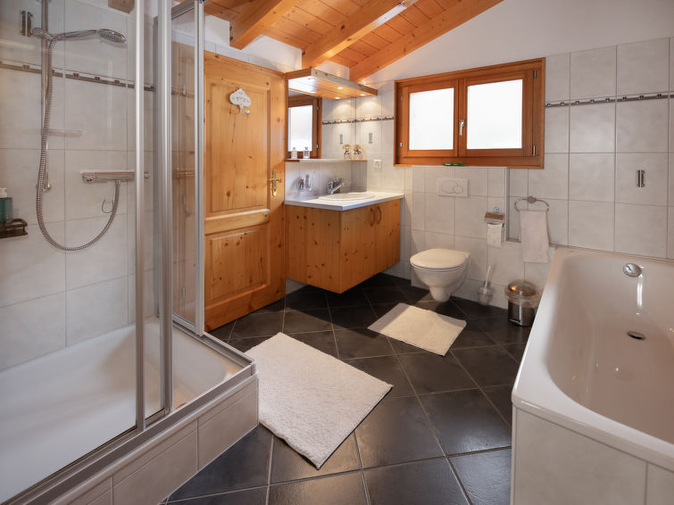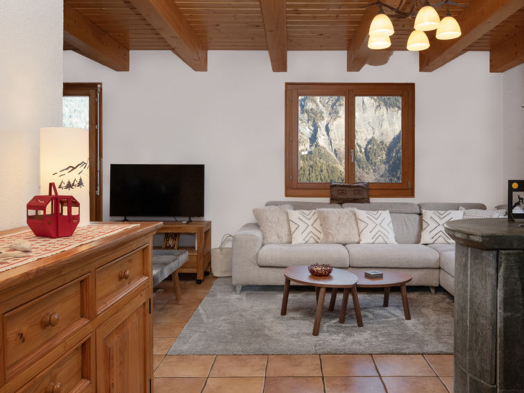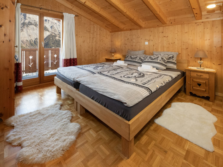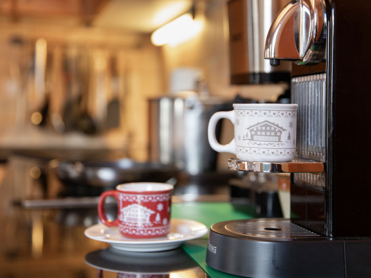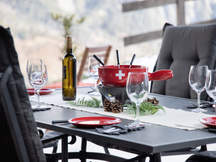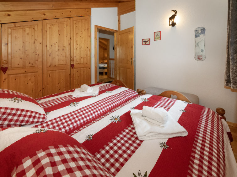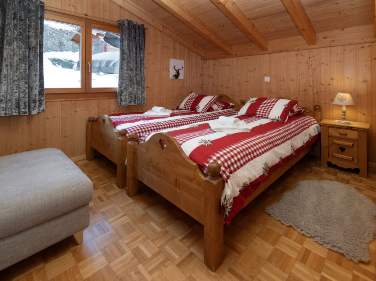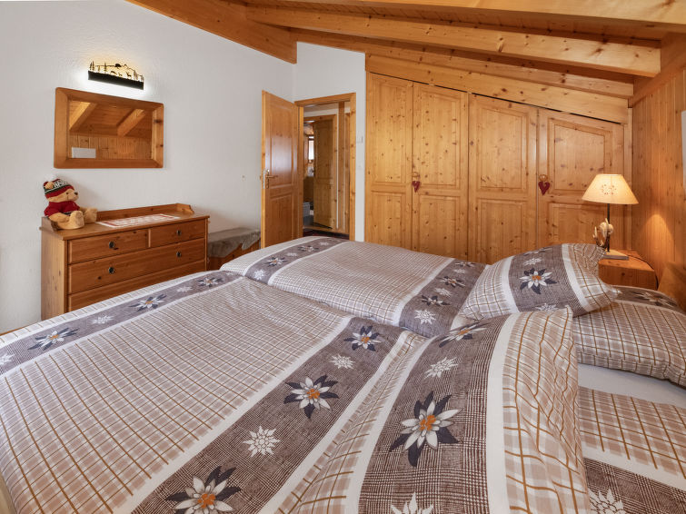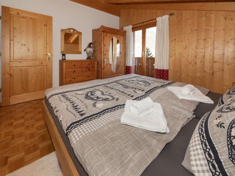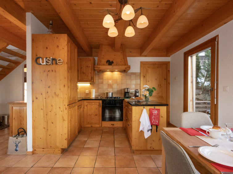 "L'Ecureuil noir", 4 rom hytte 110 m2 på 2 etasjer, østvendt beliggenhet. Luksuriøst møbler: stue/spisestue med, vedovn, internasjonale TVkanaler og DVD. Utgang til terrassen. Kjøkkenkrok (4 kokeplater, stekeovn, oppvaskmaskin, mikrobølgeovn, frys). Dusj/WC. øverste etasje: 1 rom med, 1 dobbeltseng (2 x 90 cm, lengde 200 cm), radio. Utgang til balkongen. 1 rom med 2 senger (90 cm), radio. 1 rom med 2 senger (90 cm). Bad/dusj/WC. Terrassemøbler, grill (flyttbar), liggestoler, lager. Vakker utsikt av fjellene. Fasiliteter: vaskemaskin, strykejern, barneseng for barn opp til 3 år, hårføner. Internett (trådløs LAN [WLAN]). Parkeringsplass (2 Biler). Vennligst merk: røykfri bolig. Max 1 lite kjæledyr / liten hund tillatt. Nespresso coffee machine. Capsules can be bought at the Interhome office.