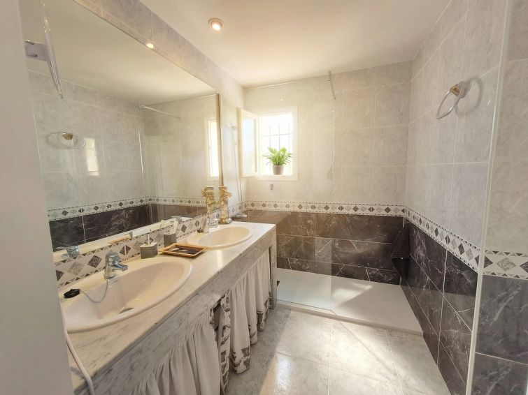 "La Reserva IV", 4 rom rekkehus 92 m2 på 2 etasjer. Smakfullt og stilfullt møbler: stue/spisestue med, digital TV og air-conditioning. Utgang til sitteplass i hagen, til badebassenget. Kjøkken (stekeovn, oppvaskmaskin, 3 keramiske kokeplater, brødrister, vannkoker, mikrobølgeovn, frys, elektrisk kaffemaskin). Sep. WC. øverste etasje: 1 rom med, 1 dobbeltseng (150 cm, lengde 190 cm), bad/WC og air-conditioning. 1 rom med 2 senger (90 cm lengde 190 cm), vifte. 1 rom med 2 senger (90 cm lengde 190 cm), vifte. Bad/WC. Oppvarmingsalternativ. Sitteplass i hagen. Terrassemøbler, grill. Fasiliteter: vaskemaskin, strykejern, høy barnestol barneseng, hårføner. Internett (trådløs LAN [WLAN], gratis). Parkeringsplass plass nr 12. Vennligst merk: bare TV ES. HUTG-050163