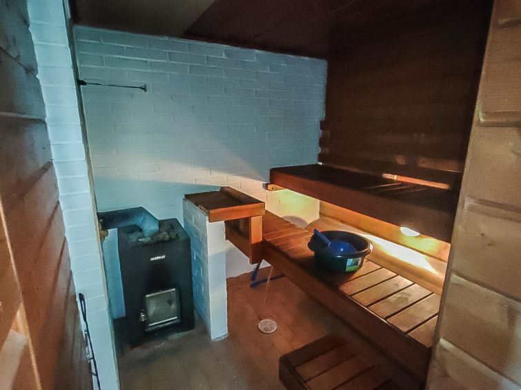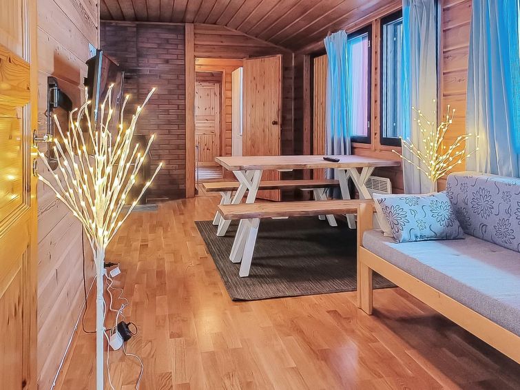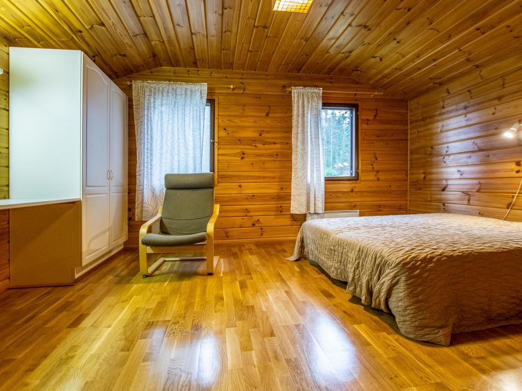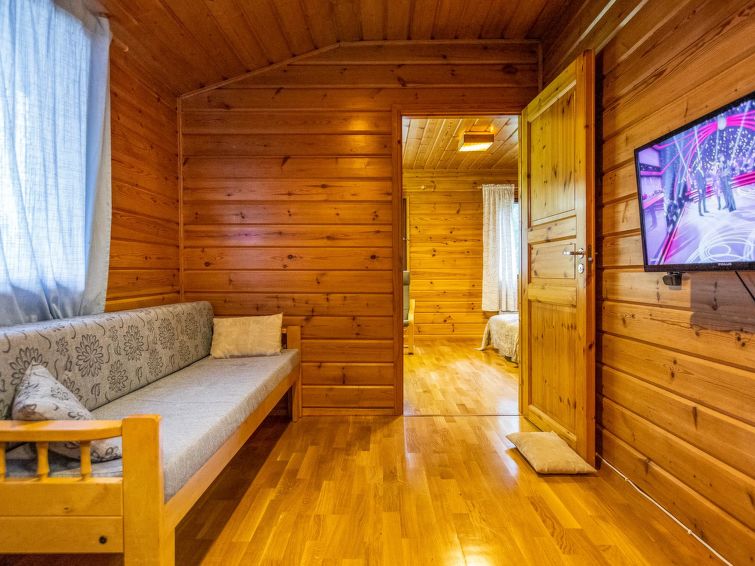 Wooden cabin with boarded outer walls (1993), living room (sofa bed 140x190 cm, bed for one), living room / kitchen, WC. Two bedrooms, each with two beds. Sauna (wood-burning sauna stove), washroom with two showers.