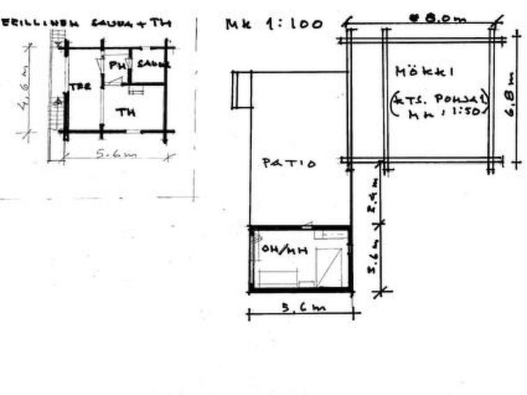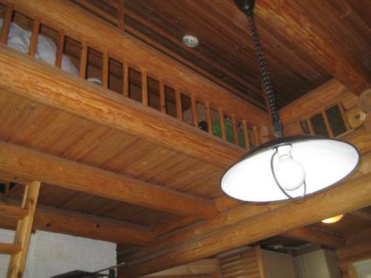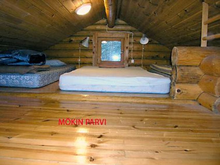 Log cottage 1984 (56 m2), living room/kitchen extra double bed, bedroom double bed, washroom with shower cubicle/WC, shallow sleeping loft 2 mattresses, and open porch.