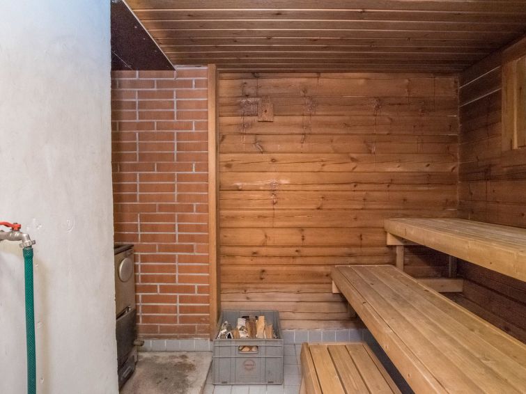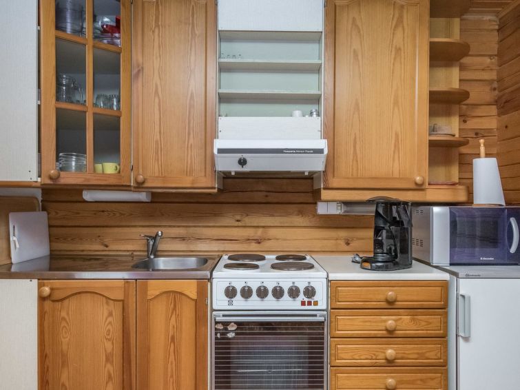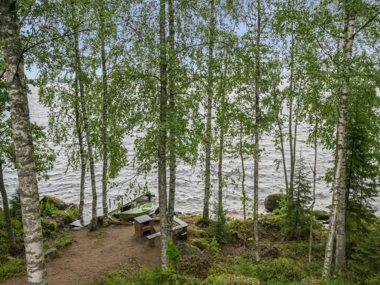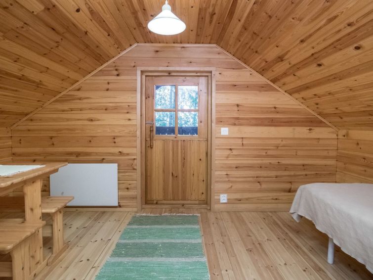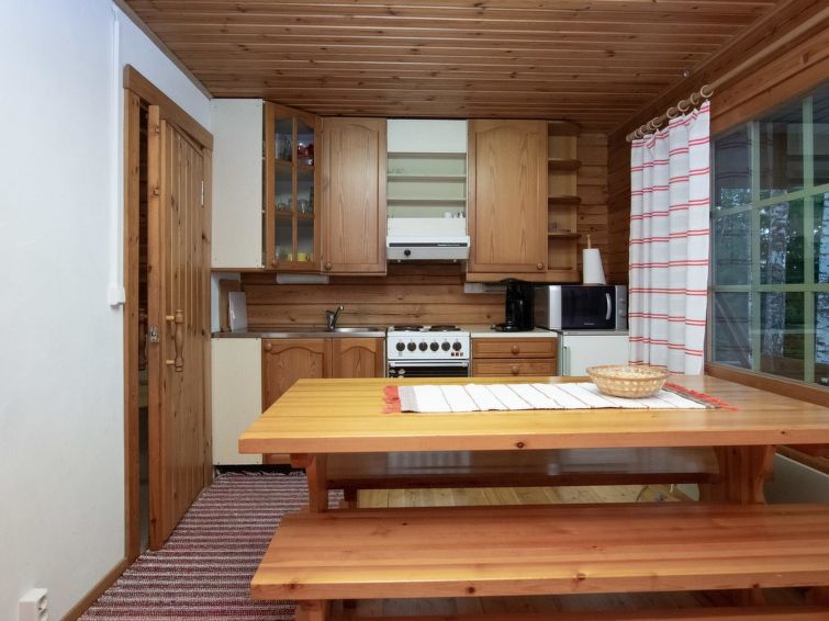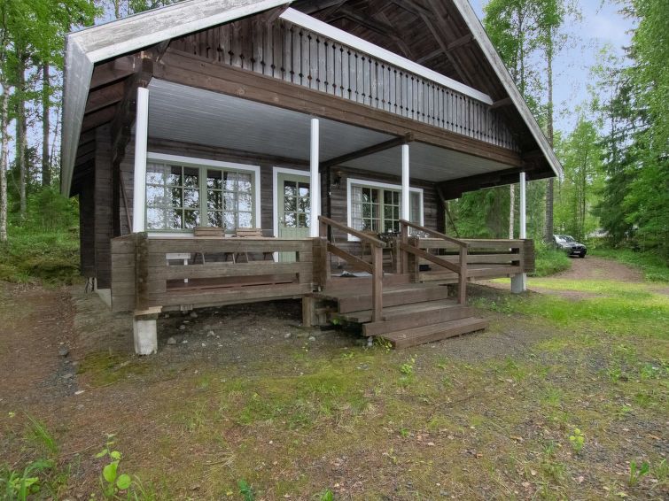 Planed log cottage 1989, renovated 2004, living room, kitchen, bedroom 2 beds, sleeping loft 2 beds and one extra bed, open porch, balcony, sauna, washroom, dressing room. Cottage yard is level, the surroundings in a natural state, with mixed forest. Due to trees there might be problems with the television signal. Slope down to shore. Behind the cottage, ab. 100 m away, a low-traffic lane.