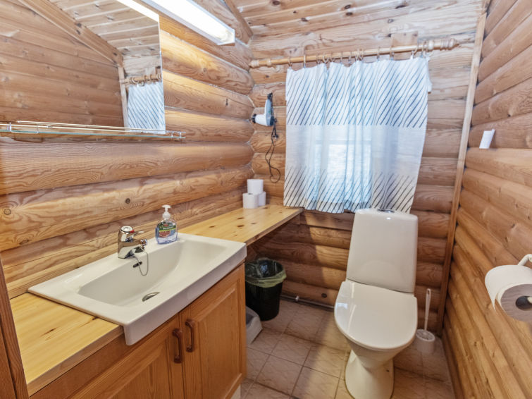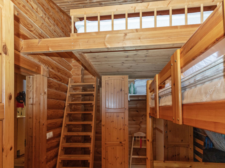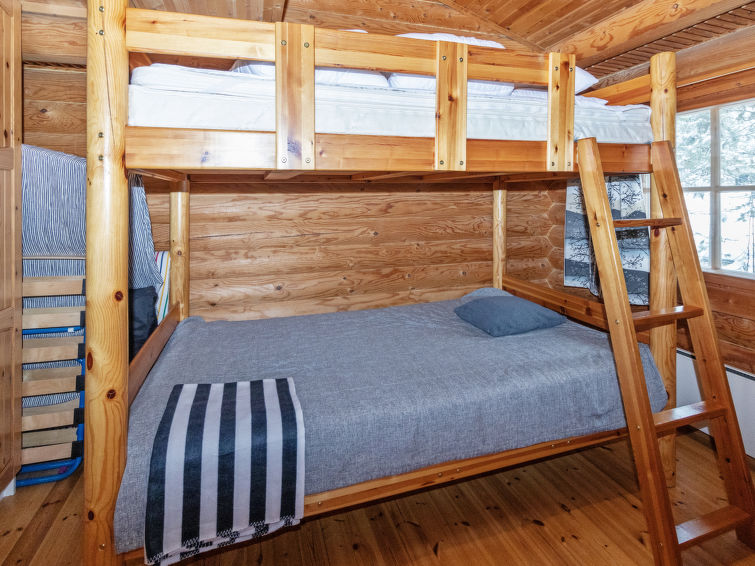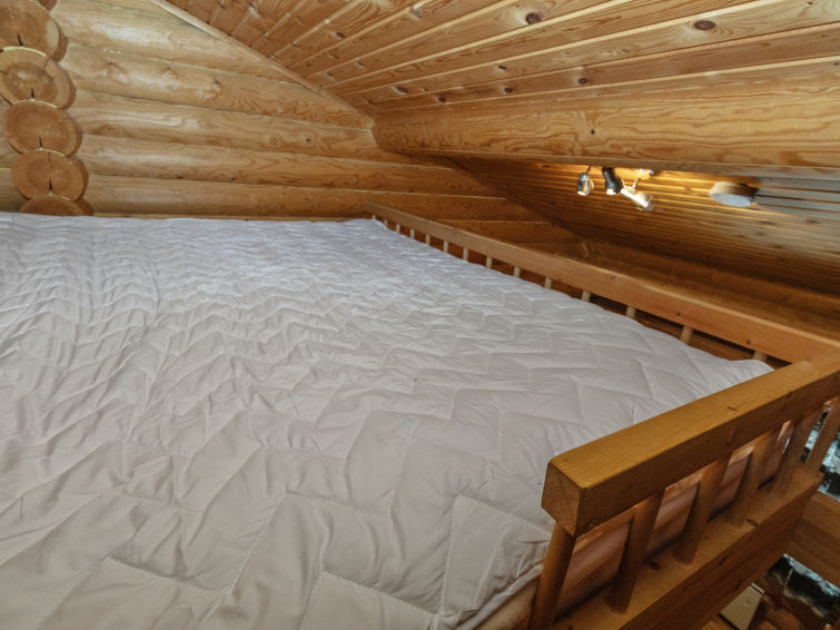 Round log cabin, built in 1991. The living room with sofa bed, bedroom with double bed, another bedroom with bunk bed (width 120 cm), bedroom also has a loft (containing 2 mattresses), sauna, washroom and separate WC. Kitchen furniture renovated in 2010.