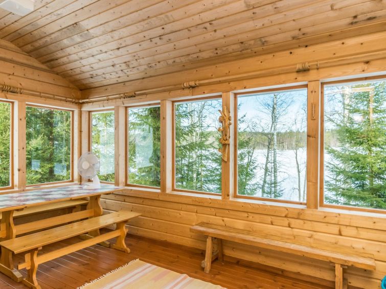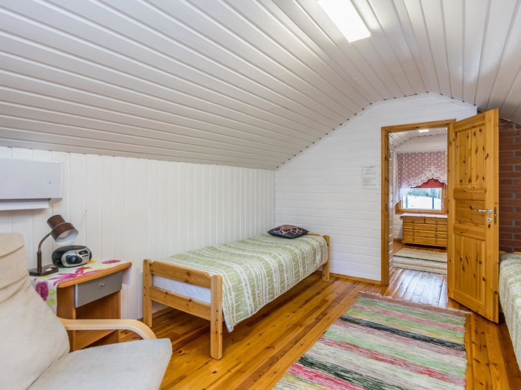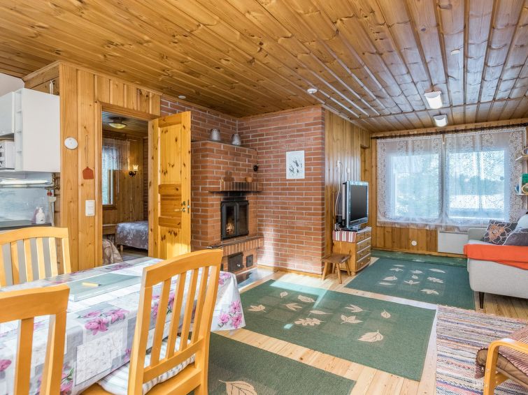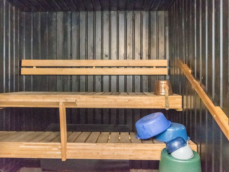 Wooden cottage 1995, living room with kitchen, bedroom 2 beds, upstairs bedroom 2 beds, upstairs "lounge room" extra double bed (bed width 140 cm), sauna, 2 glazed terraces (20 m² and 14 m²). Toilet is in the hallway of sauna, curtain can drawn in front of toilet (see picture). Patio.