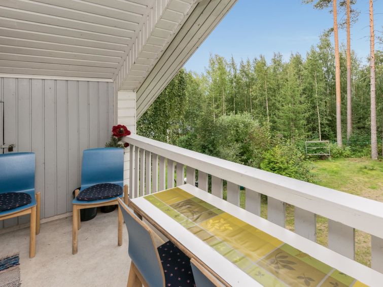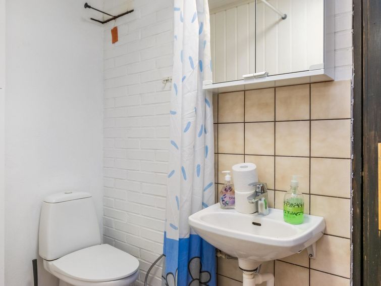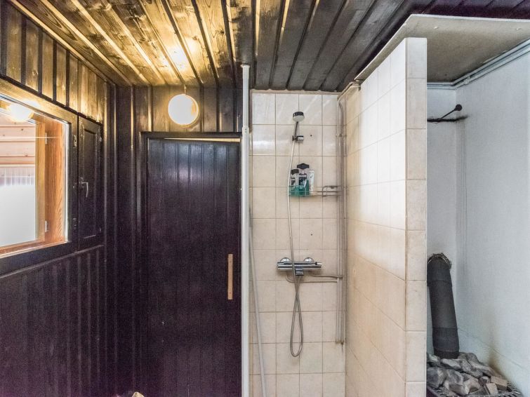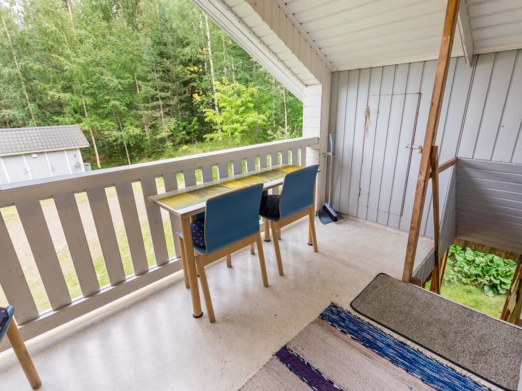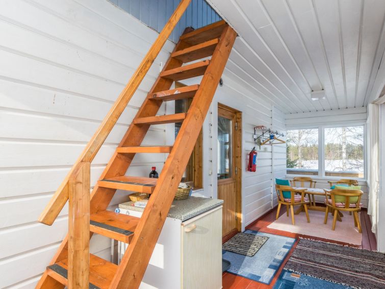 Storage, woodshed, baby bed and high chair. A cottage on a grassy hillside yard. Suitable eg. for one family. Passage to upstairs through porch and outdoor balcony via steep stairs. Upstairs is 24 m² and a balcony of 7 m². Toilet is "a pass-through room" without a door, on the way from the kitchen to the back terrace and sauna. The shower is in the sauna's steam room.