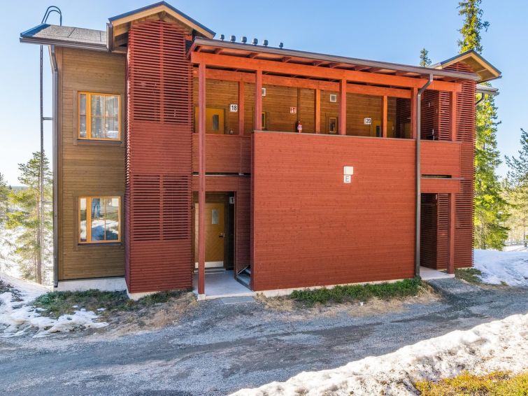 29km north of Kuusamo, Ruka village (Western Ruka) 450m. Apartment (built of wood/stone), built in 2008, situated house´s second floor, bedroom1: 2 spring mattress beds, bedroom2: 2 spring mattress beds, living room: sofabed for 2, combined kitchen/living room, electric sauna. Other apartments in the area. View towards the lake Talvijärvi.