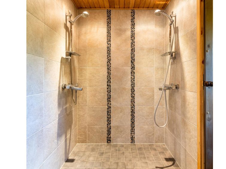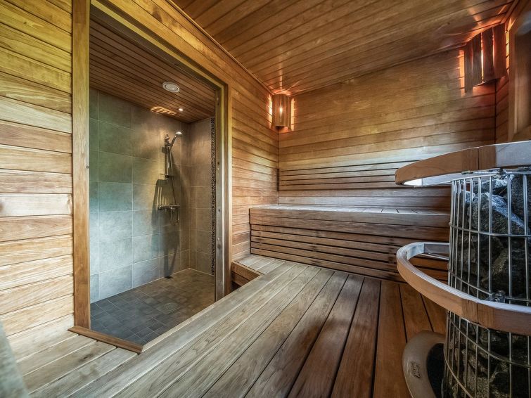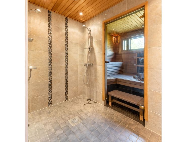 Downstairs: living room, fireplace, open plan kitchen, hall, shower room with two showers, electric sauna, bedroom with double bed, bed room with 2 beds, 2 toilets, large terrace.