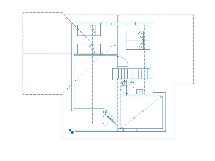 Upstairs: bedroom with double bed, bedroom with 2 beds, lounge with convertible sofa for 2 persons, toilet, balcony.