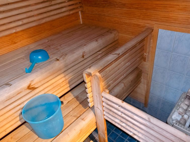 Wooden cabin. Living room, 3 bedrooms, all with 2 beds, one bedroom with folding door, kitchenette, sauna, washroom, separate WC and covered terrace.