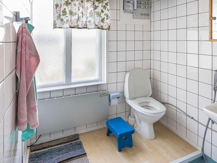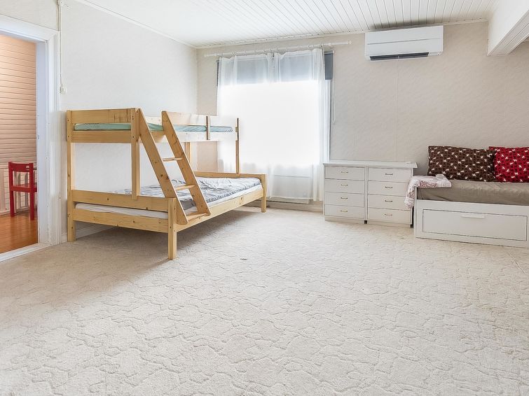 On the upper floor, there are two bedrooms separated by curtain. The master bedroom has a double bed and sofa bed. Another bedroom has a bunk bed. Lower bed is 120 cm wide and the upper bed is 80 cm wide. In addition, the room has a spreadable sofa bed, TV and DVD-player. Some extra beds are available by using cubic chair beds (3 beds total). On the upper floor, there are also newly renovated washroom and electric sauna.