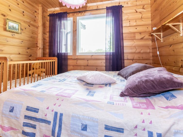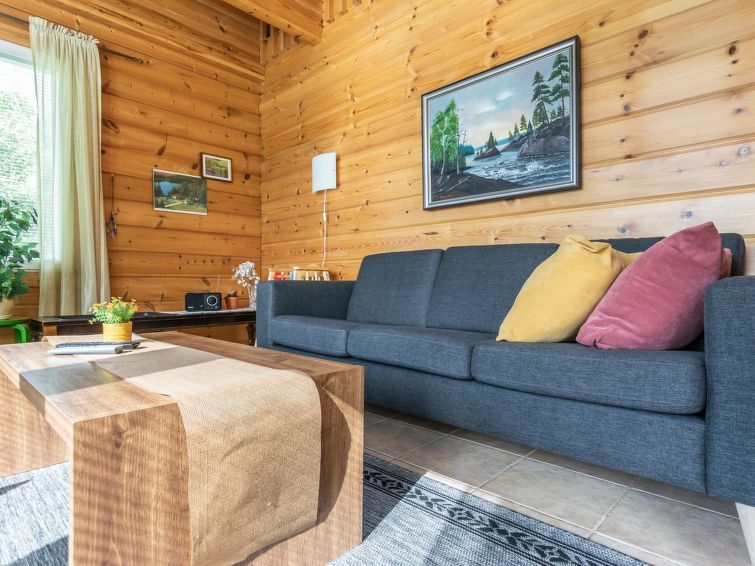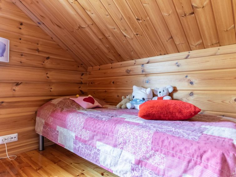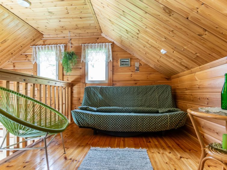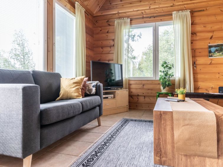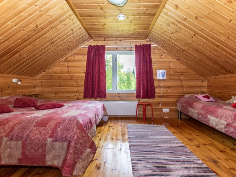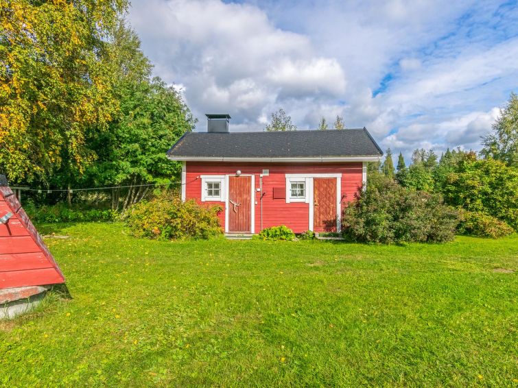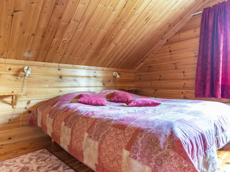 This log cottage located by the river Tenetti in Sotkamo was completed in 2005. Floor area 91 m². On the ground floor there is combined living room & kitchen, bedroom1: with twin bed, sauna (electric heating), washroom, toilet. Upstairs is bedroom2: with twin bed and one bed. Loft with spread bunk beds for 1-3 persons.