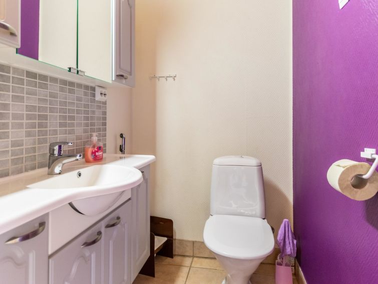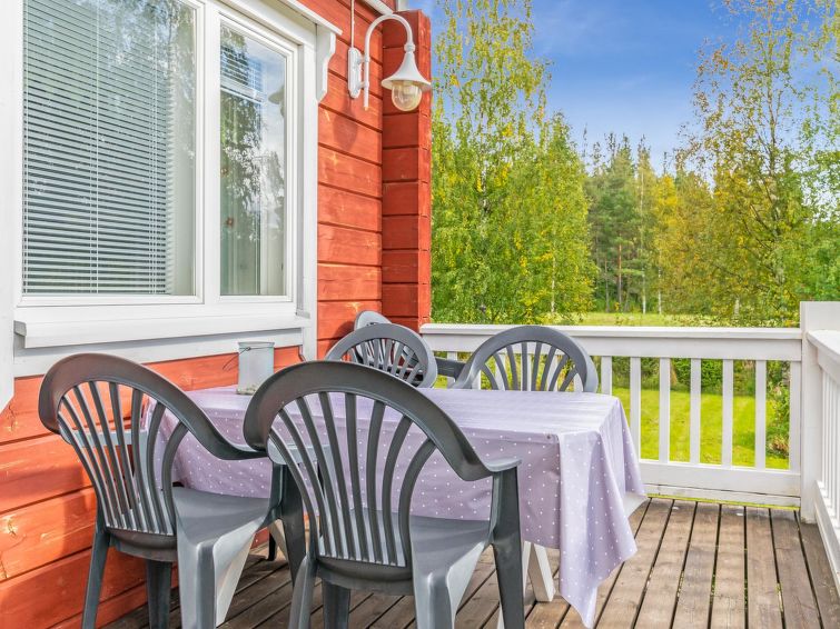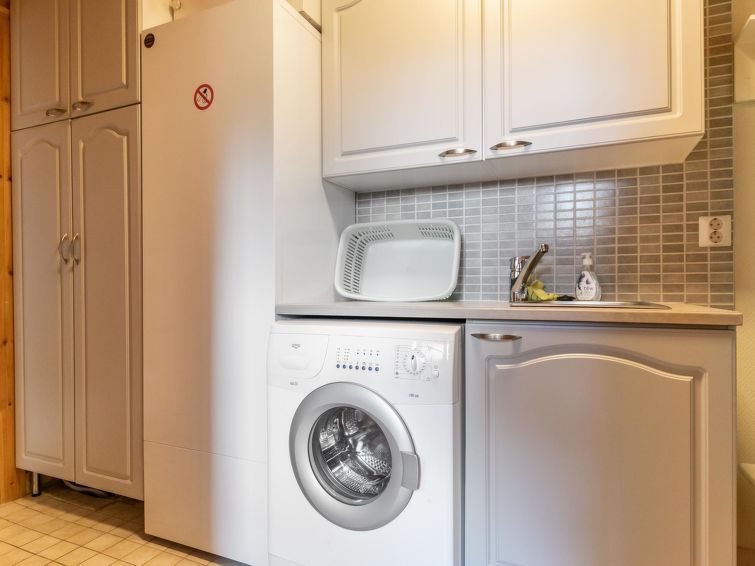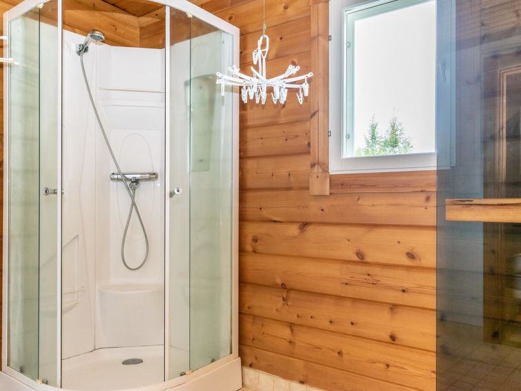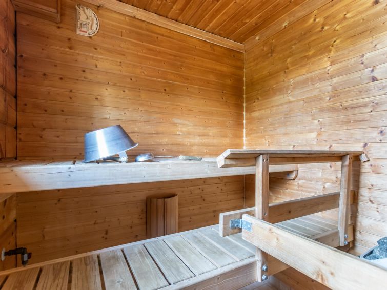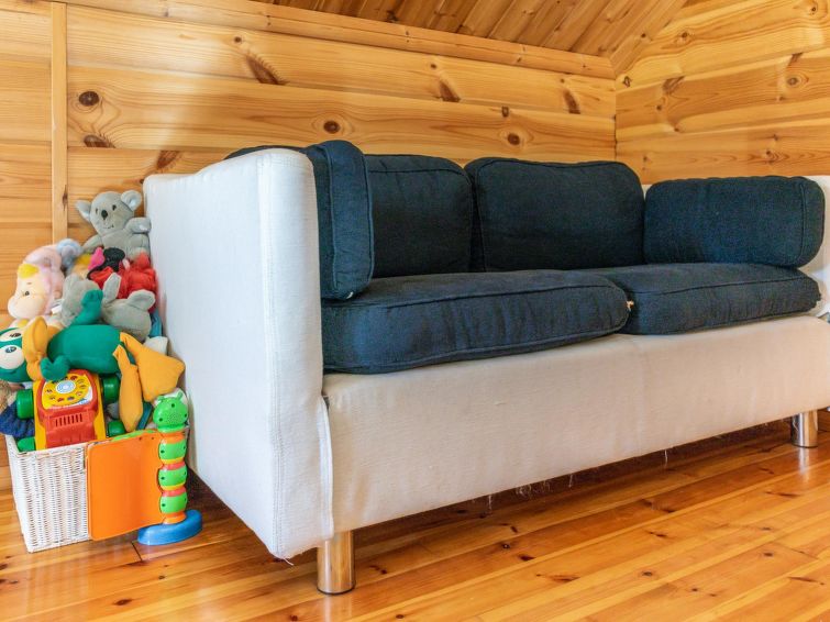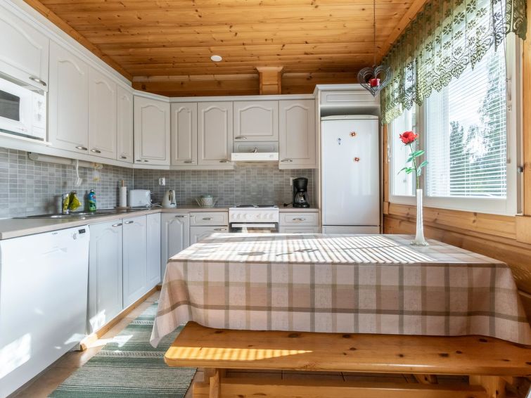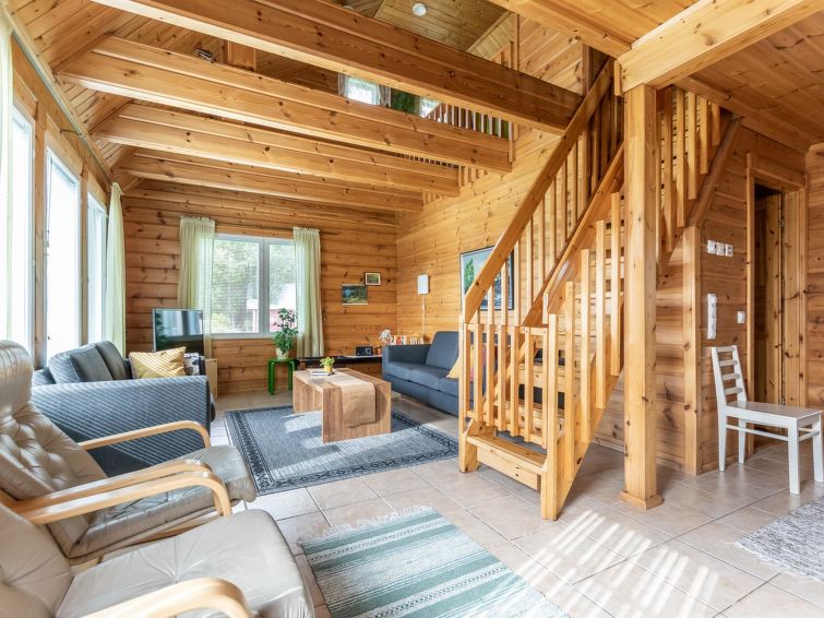 This log cottage located by the river Tenetti in Sotkamo was completed in 2005. Floor area 91 m². On the ground floor there is combined living room & kitchen, bedroom1: with twin bed, sauna (electric heating), washroom, toilet. Upstairs is bedroom2: with twin bed and one bed. Loft with spread bunk beds for 1-3 persons.
