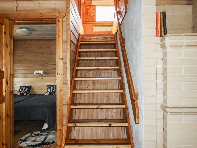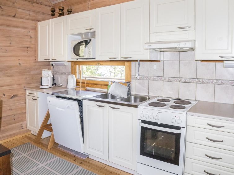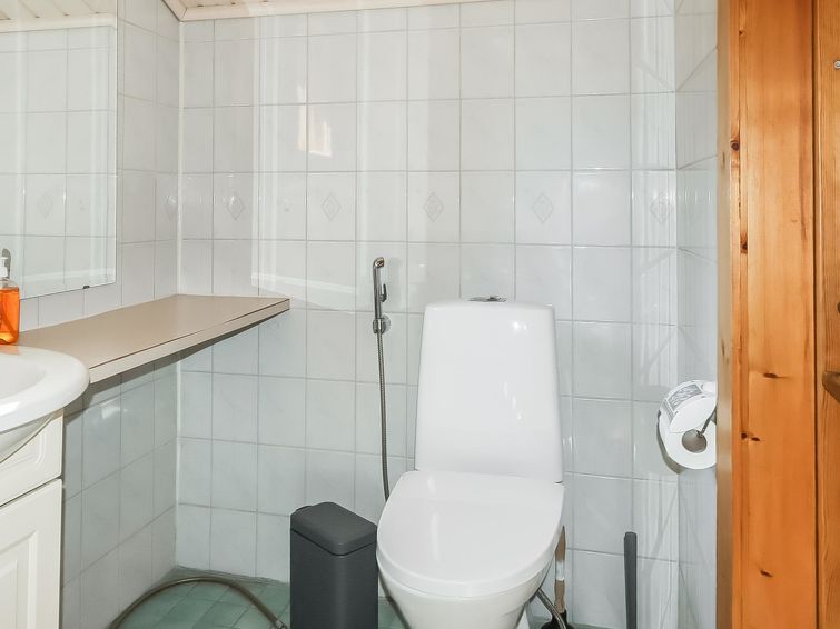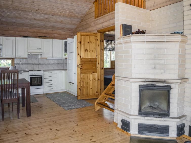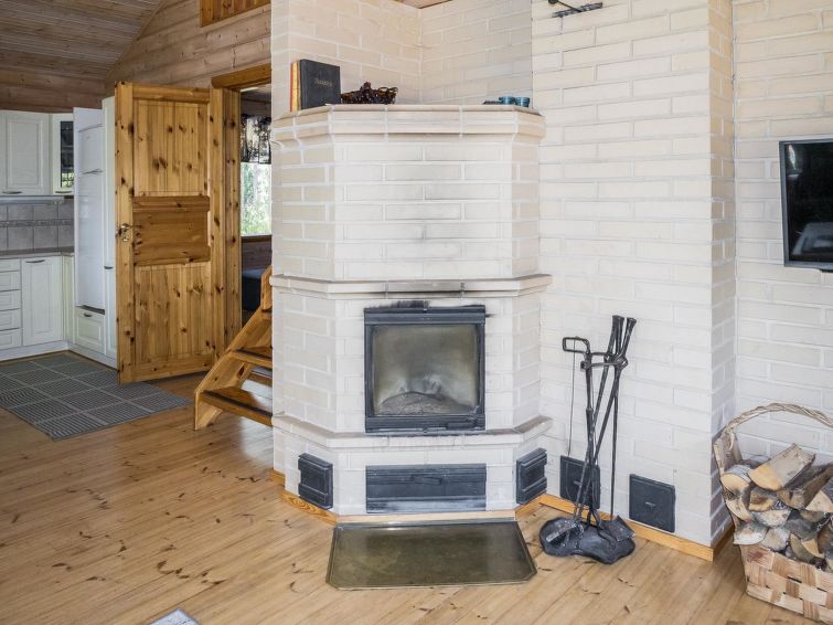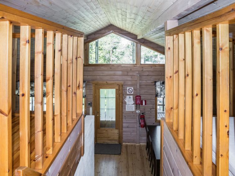 50 km north of Turku, L.Mynäjärvi 15 m (length 1 km, width 1 km), deep, soft mud bottom, own boat. Planed log cottage 2002, living room/kitchen convertible sofa/bed, bedroom 2 beds, sleeping loft (4 m²) mattresses for 3 persons, hall, washroom (shower), sauna (wood-burning stove), separate indoor WC, large, partly roofed porch. Grill tepee. Yard lighting. Log cottage with modern conveniences, located on the shore of a darkwater wilderness lake in Kurjenrahka National Park. Very quite location, nearest neighbour 300 m away. Upper part of yard area level and light. Steep steps from cottage to lake shore. Swimming only possible from jetty.
