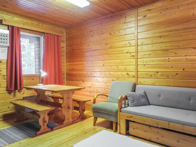 Massive square log cabin, inner walls are paneled, built in 1990. Living room/kitchen with spreadable sofa, bedroom with 2 beds, sauna, washroom/WC, sauna, covered veranda. NO TV available (poor reception). Wheelchair ramp to veranda.