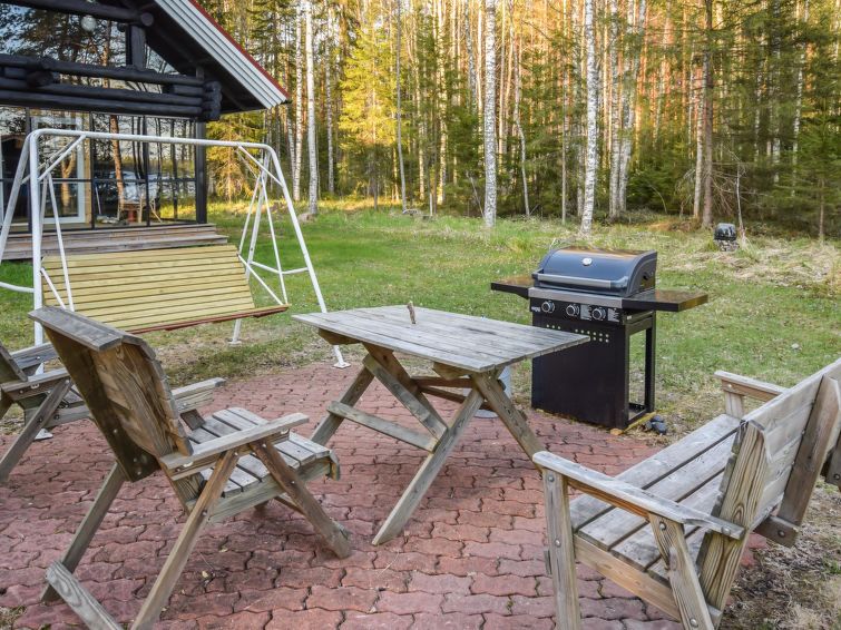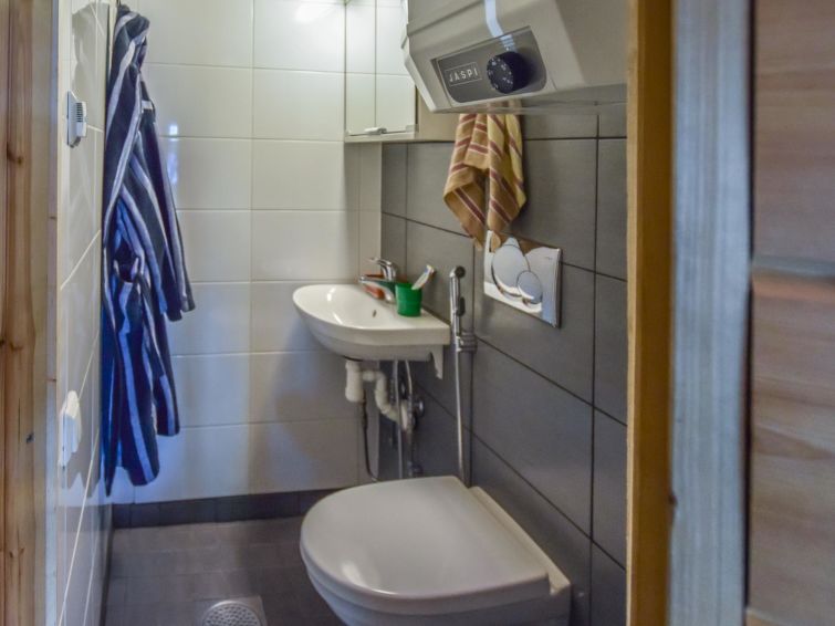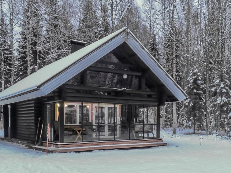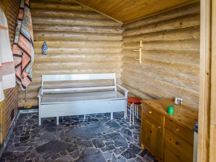 Log house 1987, renovation 2015, kitchen, living room/dining room, small bedroom with convertible bed, in the loft double bed and two beds, toilet, big glazed terrace. You can have a shower in the toilet (by using handshower).