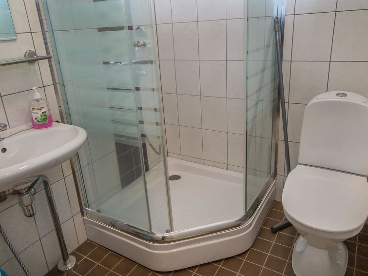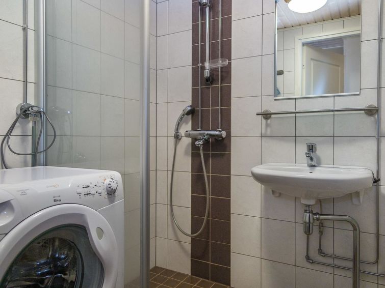 Living room/kitchen, bedroom with double bed. Washing room, WC, sauna (electric stove), hall and from balcony view to the slopes. Upstairs bedroom with 2 beds and a loft with 2 beds, on the upper floor there is another shower and toilet. Ski storage, 2-car plugs for cars.