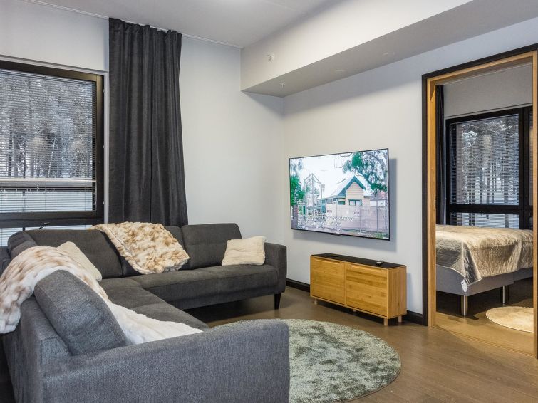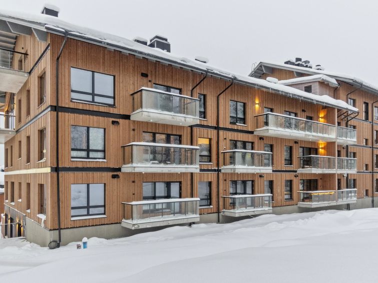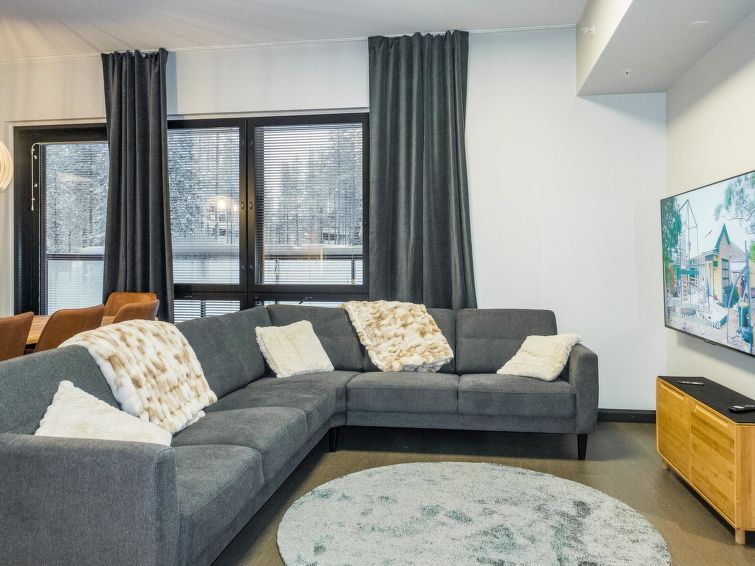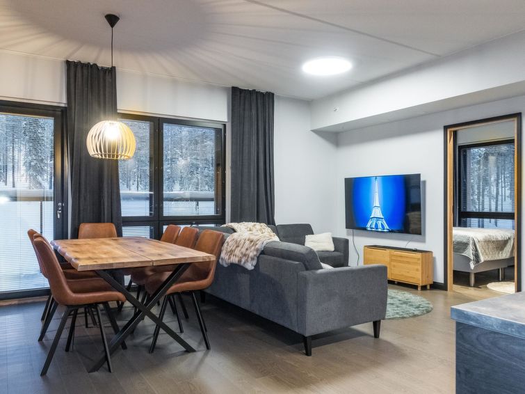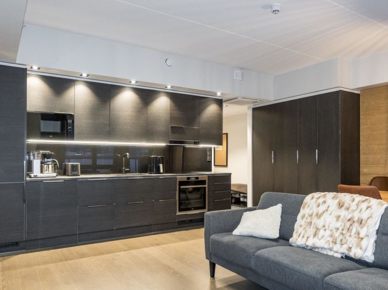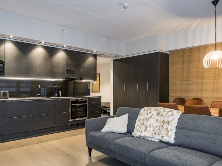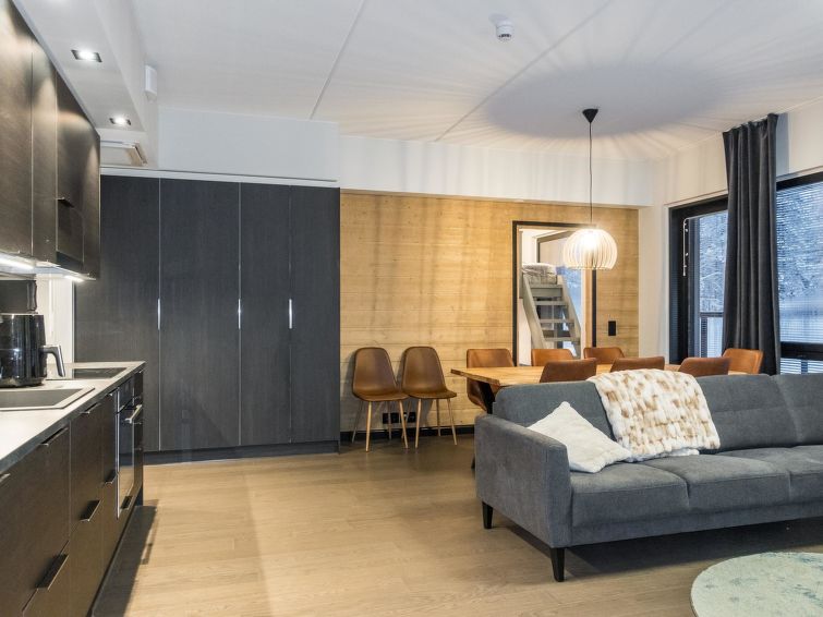 Levi Kahnu is a modern holiday apartment situated in a prime location in Levi, right next to the Front Slopes and Glacier Express chairlift. As you step into this alpine-style Cranberry House apartment on the third floor, you'll find a spacious open-plan kitchen and living area exuding both elegance and comfort.