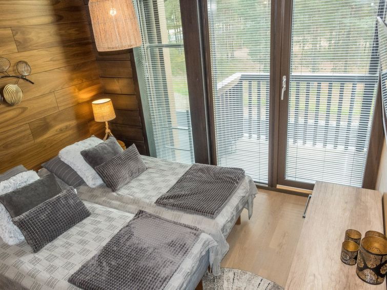 On the upper floor, there is a bedroom with two beds. The bedroom has access to a balcony. There are also two beds on the upper floor loft. The upper floor also includes a WC.