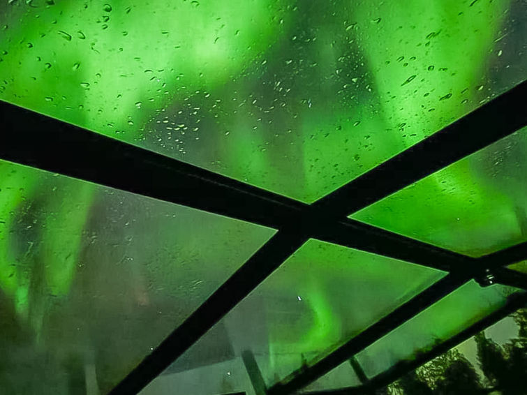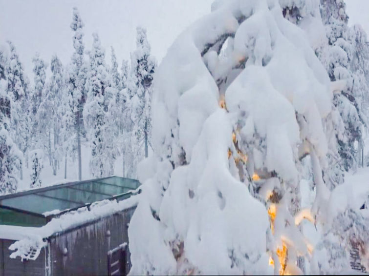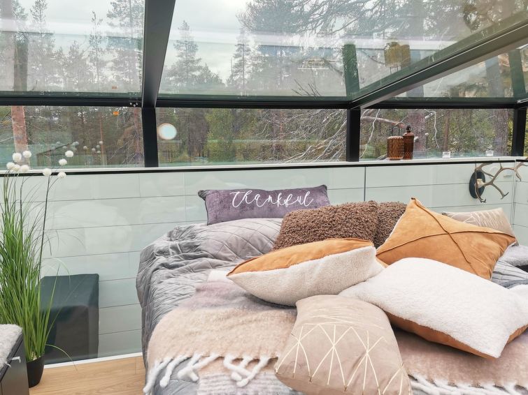 Modern igloo-style cabin with a glass roof. The glass roof is equipped with heating from the inside and outside, so viewing aurora borealis, starry sky and fell scenery is always easy.