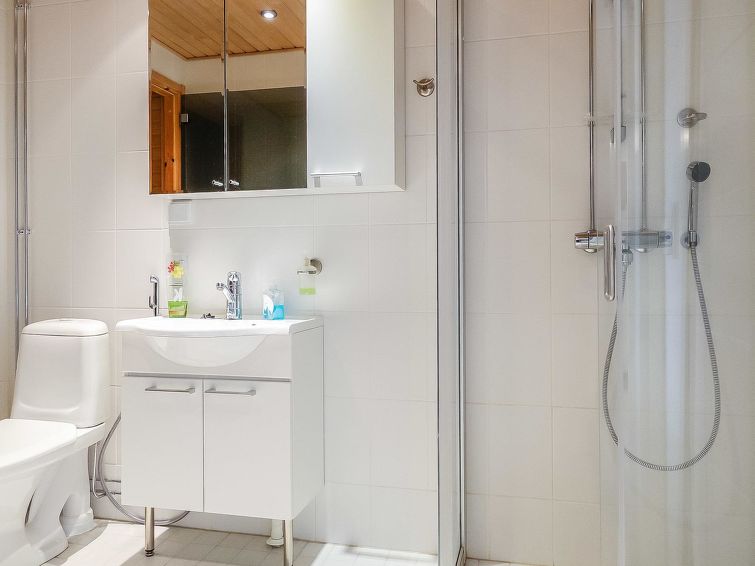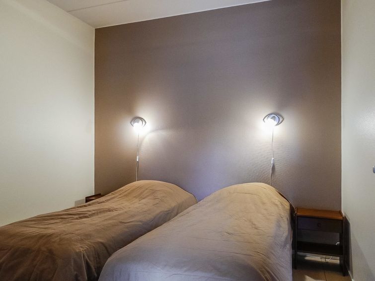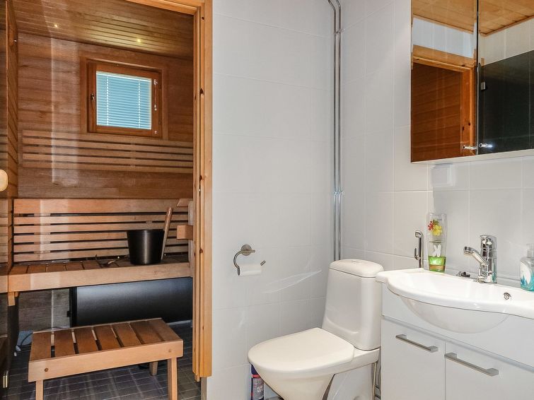 Living room/kitchen with convertible sofa/bed, 1 bedroom with 2 beds, sauna (electric stove), washroom/WC. House also has washing machine, spin drier, heated ski care room; apartment has its own lockable storage locker.
