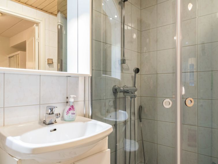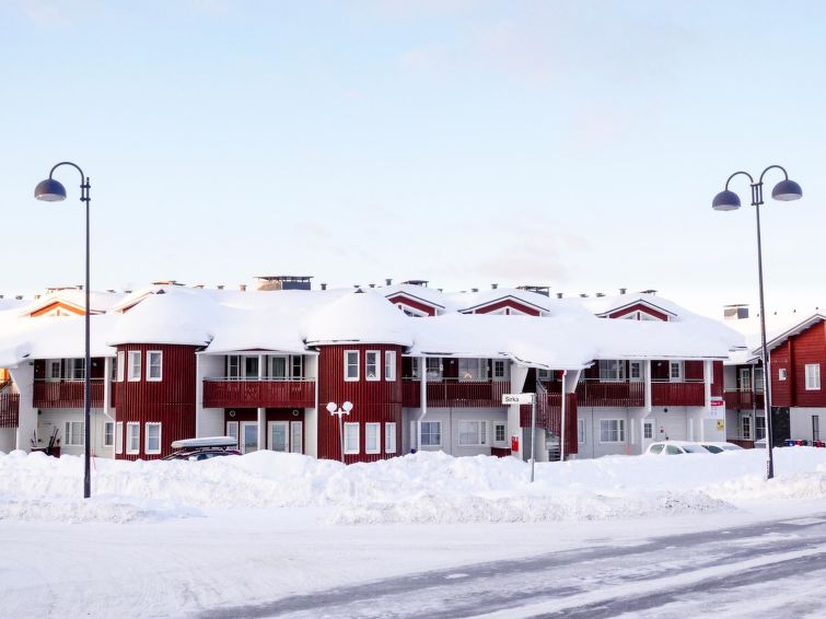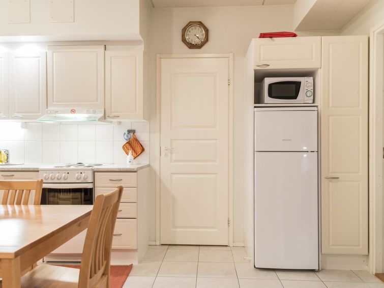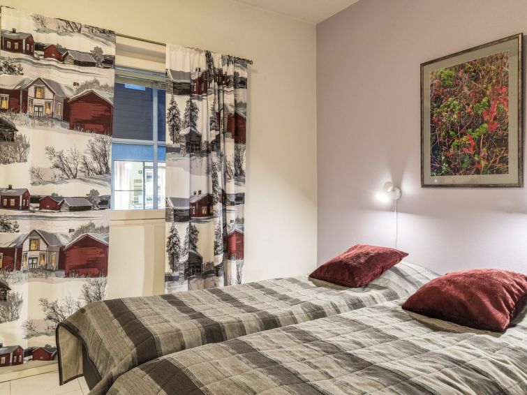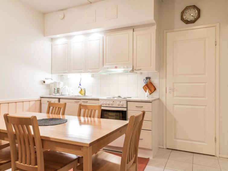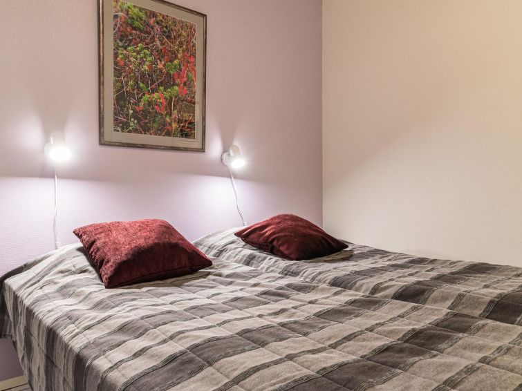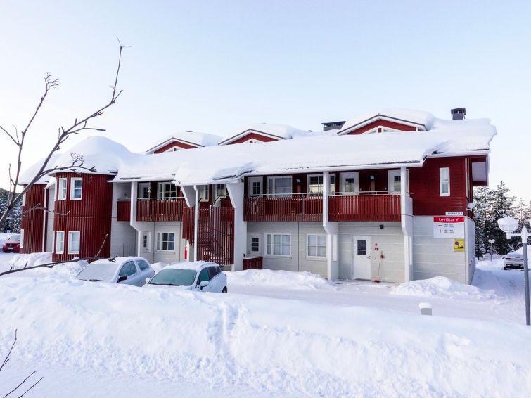 In central part of Levi holiday resort, wood and stone end apartment on one level on lowest floor of apartment hotel built 2006. Living room/kitchen with convertible sofa/bed, 2 bedrooms each with 2 beds, sauna (electric stove), washroom/WC. House also has washing machine, dryer, vacuum cleaner and heated ski care room; apartment has its own lockable storage locker. Handy apartment in heart of Levicentre. All services within walking distance. For example, restaurants 300 - 600 m, spa 650 m, ski slope 650 m. Golf course 4 km. FINAL CLEANING IS INCLUDED IN THE PRICES.