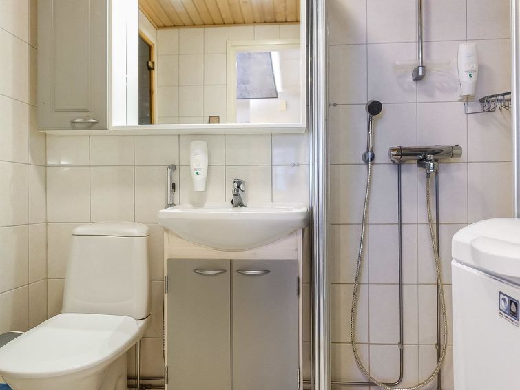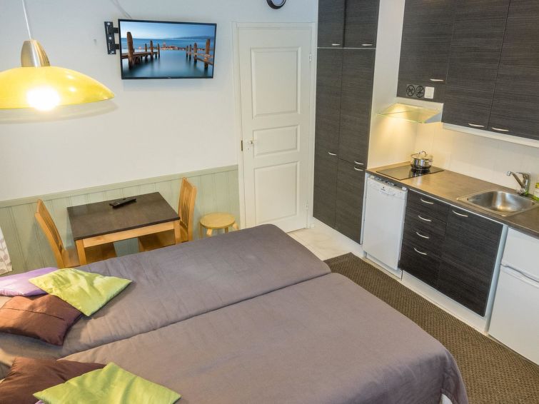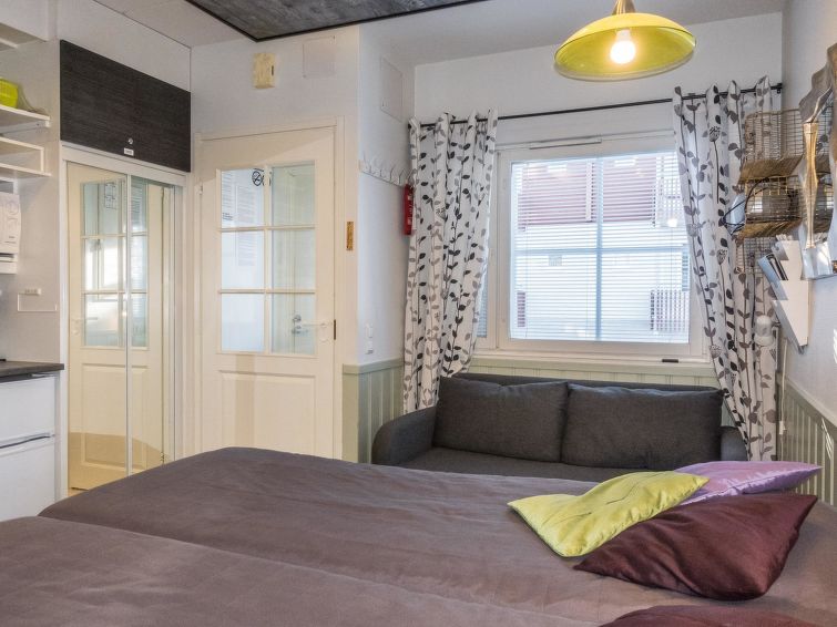 In the center of Levi tourist center. Apartment on the ground floor in an apartment hotel. House is made from timber and concrete and it was built in 2004. Apartment consists of living room/kitchen (2 single beds) sauna and washroom.