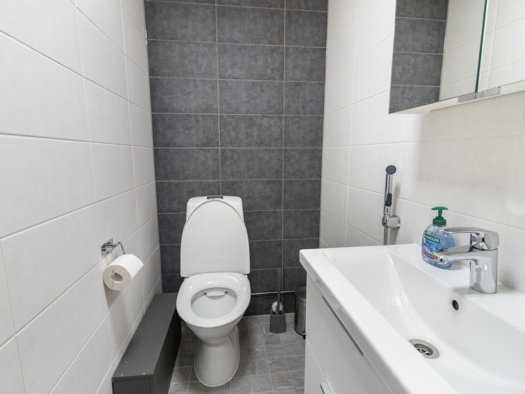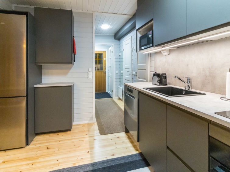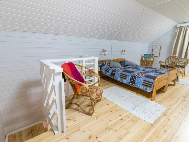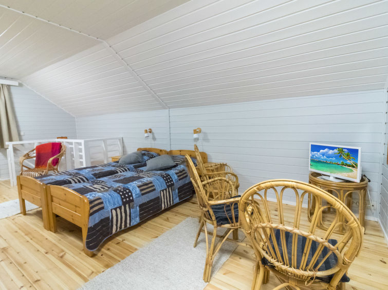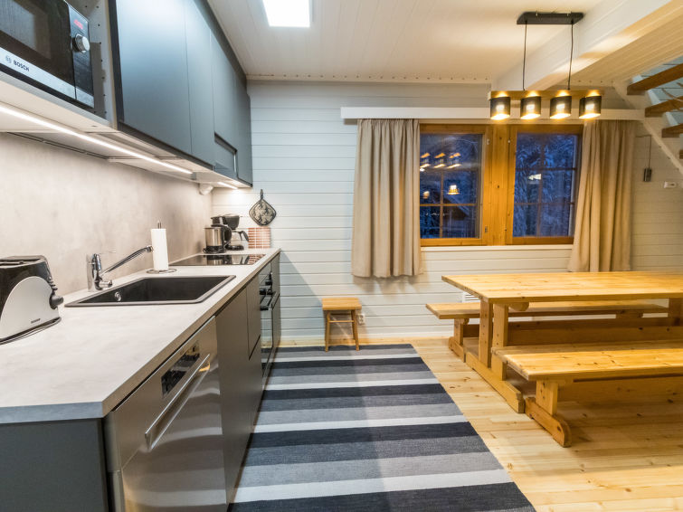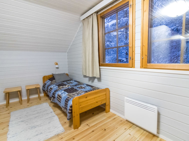 Wooden cabin, built in 1986. On the ground floor, living room/kitchen, 2 bedrooms, both with double beds, sauna, washroom and separate WC. Spacious upper floor, separated into two compartments by using wardrobes as divider. 5 beds (2 of which are 120 cm wide) on the upper floor. In addition, warm storage, covered porch and balcony. Levilla is a spacious cabin within a nice distance of the Levi tourist center. The nearest ski slope is Eturinne located in Levi center 1,8 km. The illuminated ski track is situated nearby (on the other side of the road, distance is about 100 m).