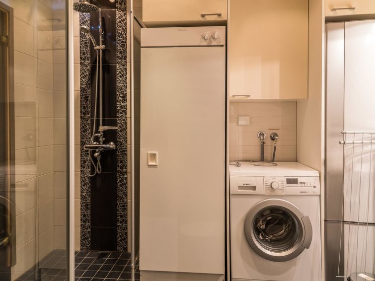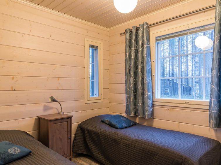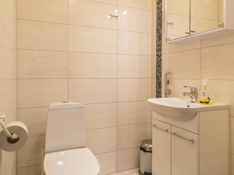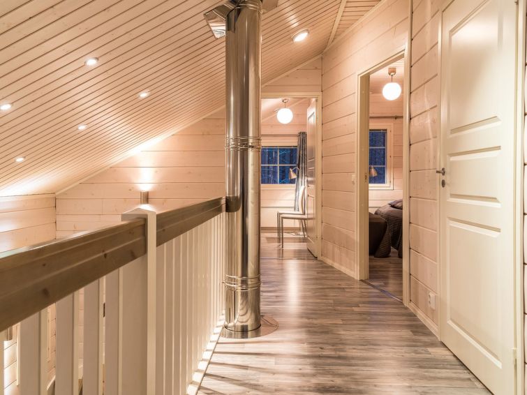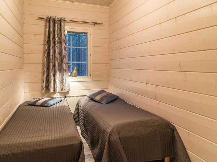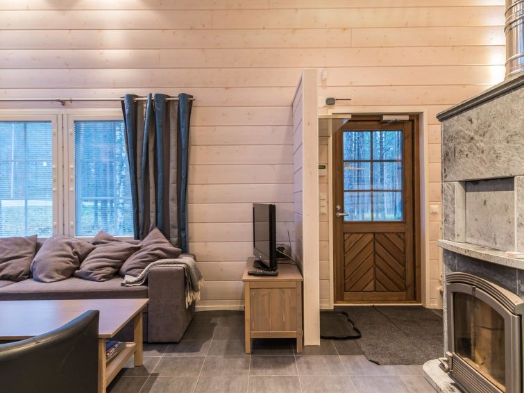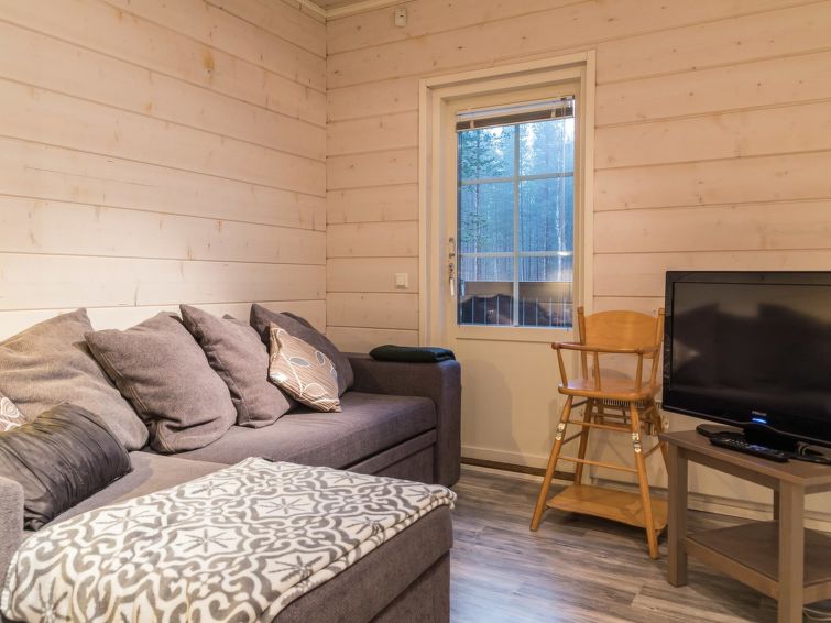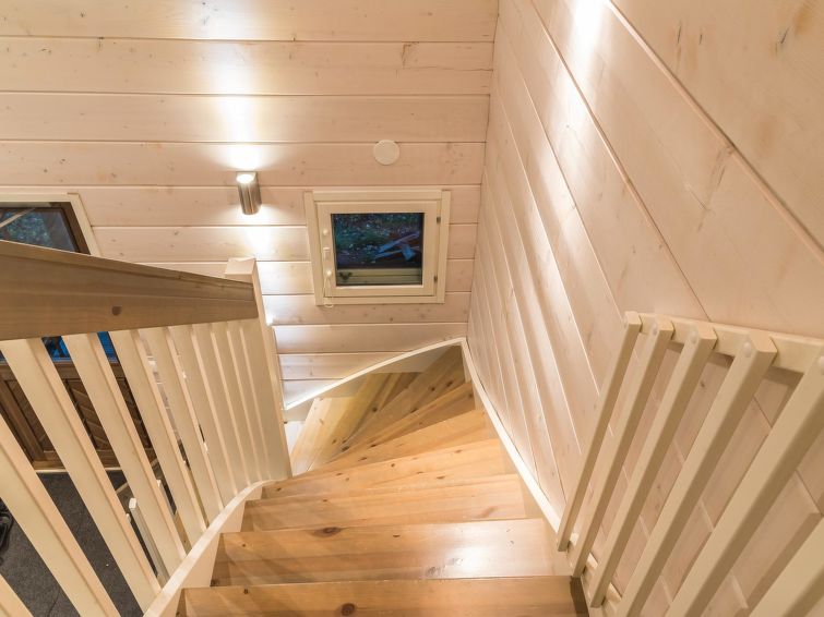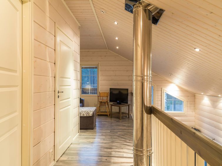 One half (apartment) of semi-detached log panel house unit 2011. Downstairs: living room/kitchen convertible sofa/bed, bedroom 2 beds, sauna (electric stove), washroom (2 showers), WC. Upstairs: 2 bedrooms with 2 beds in each, loft lounge convertible sofa/bed, balcony, a WC also upstairs. Child’s travel bed. Child gate on the stairs both on the upper floor and on the ground floor.