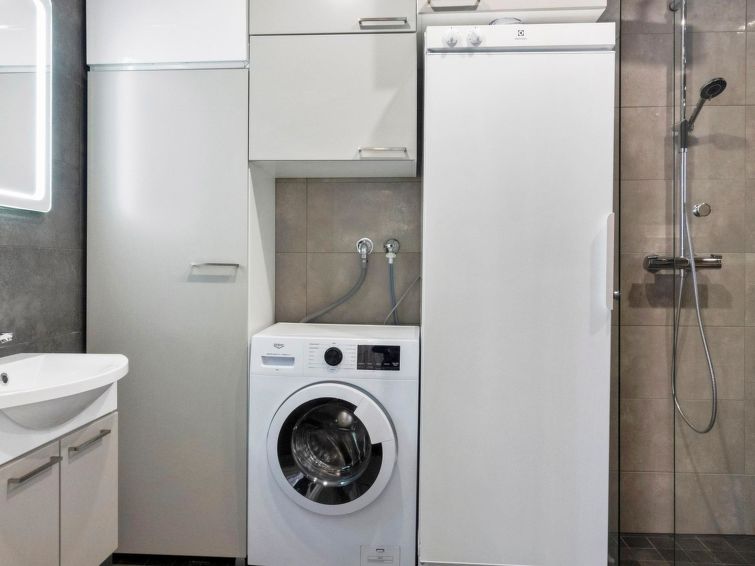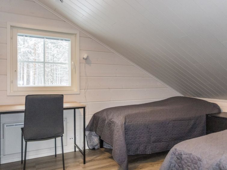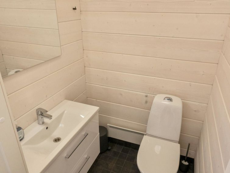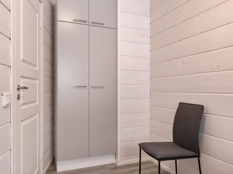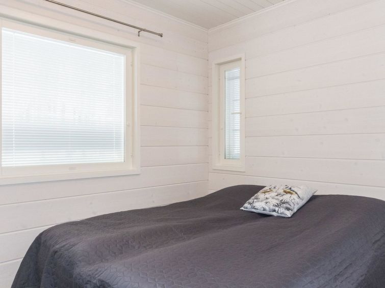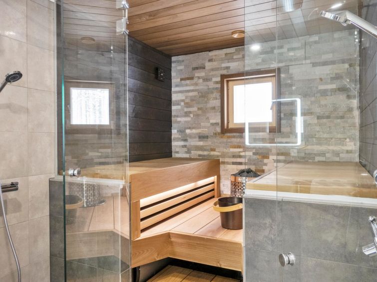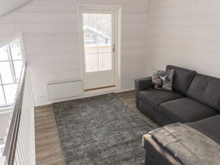 Facilities on two floors. On the ground floor, living room/kitchen, bedroom with two beds, sauna, washroom and WC. On the upper floor, 2 bedrooms, both with 2 beds, living area with sofa bed, WC and balcony.