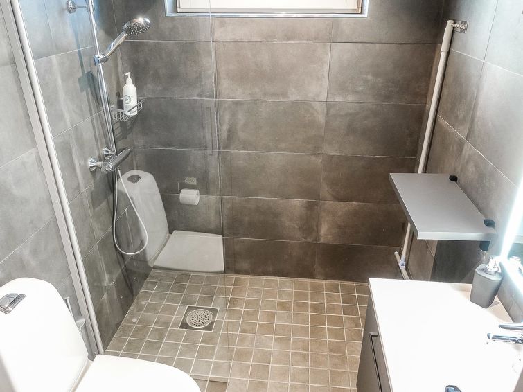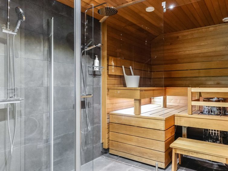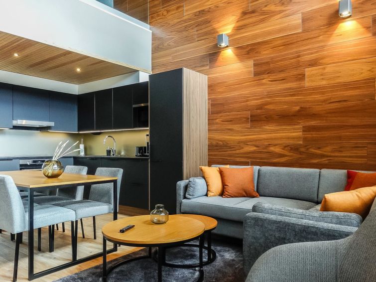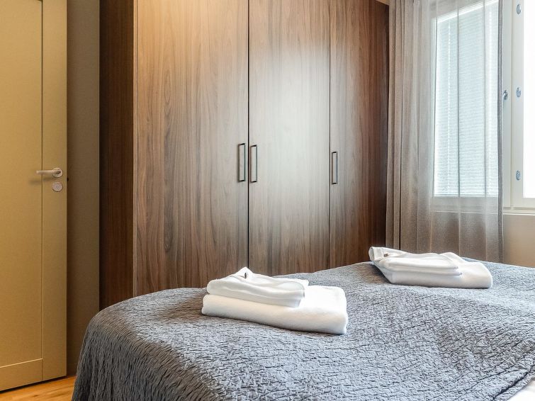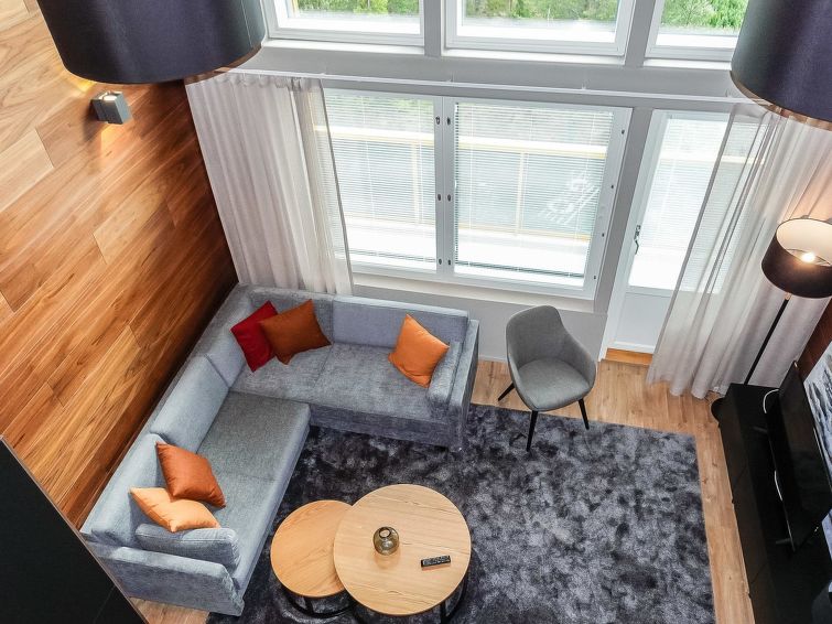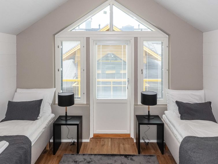 Living room/kitchen with sofa bed, three bedrooms, one with double bed and others with two single beds. One of the bedrooms is on the upper floor, access to balcony from this room. Sauna and living areas are also located on the upper floor. Living area is equipped with sofa bed, light fireplace, kitchen with sink, fridge and cupboard. There are two WCs in the apartment, shower also in downstairs within the WC. Another is upstairs in the sauna area.