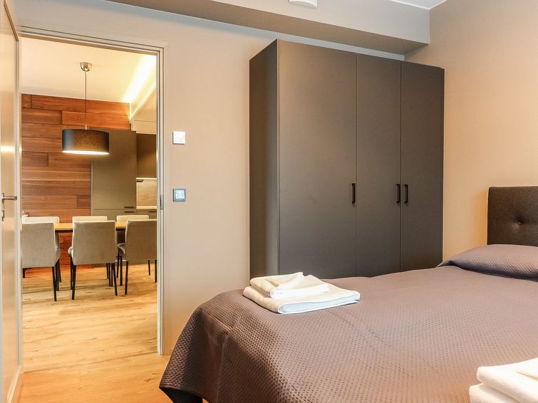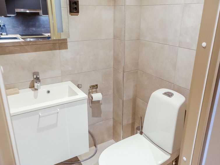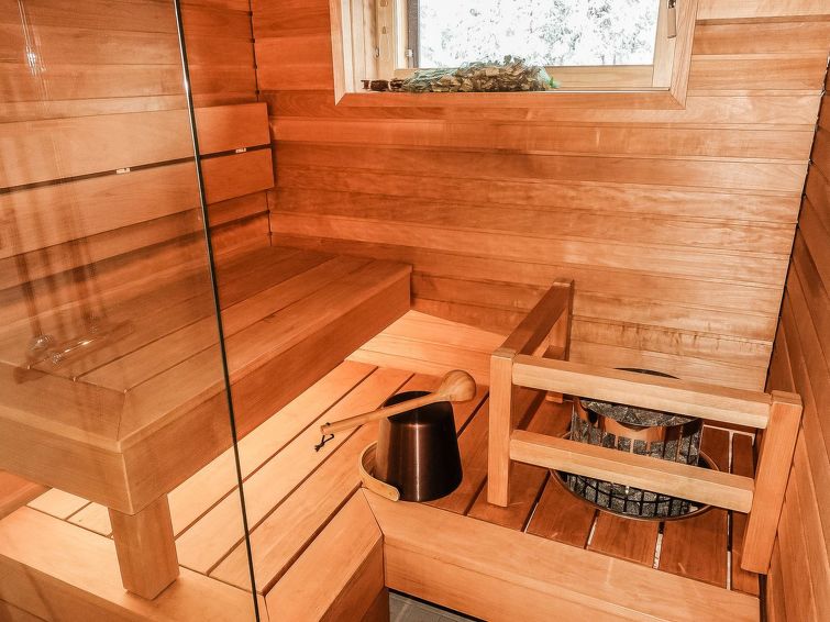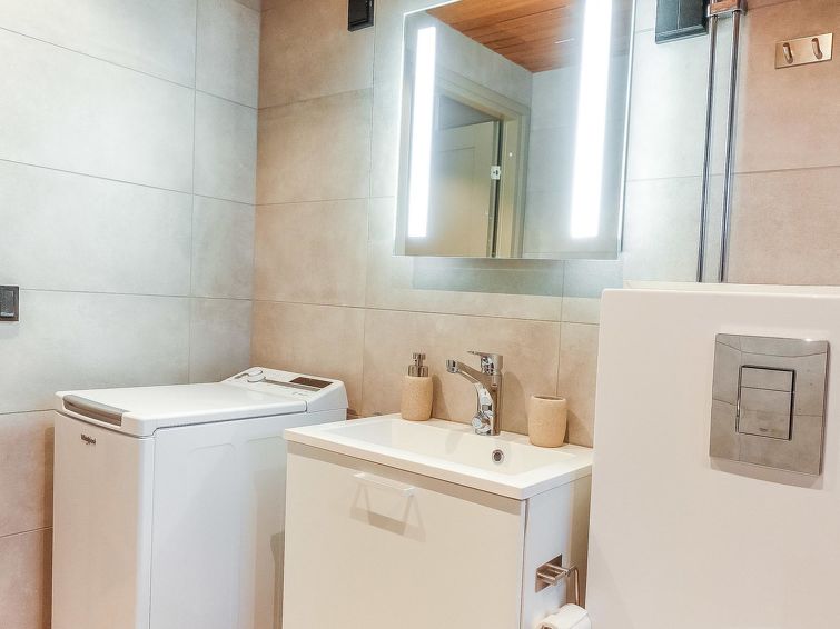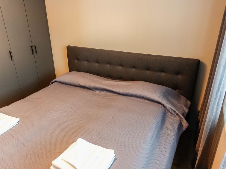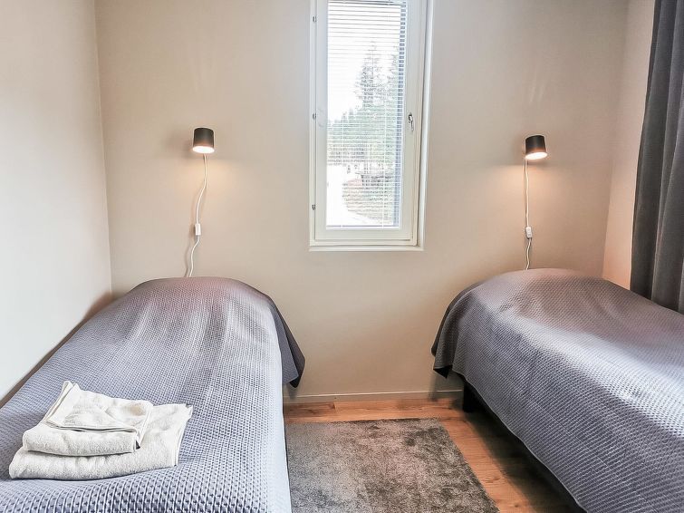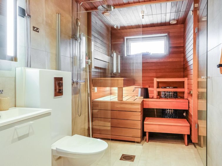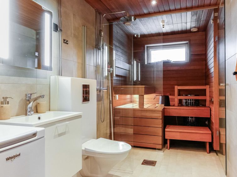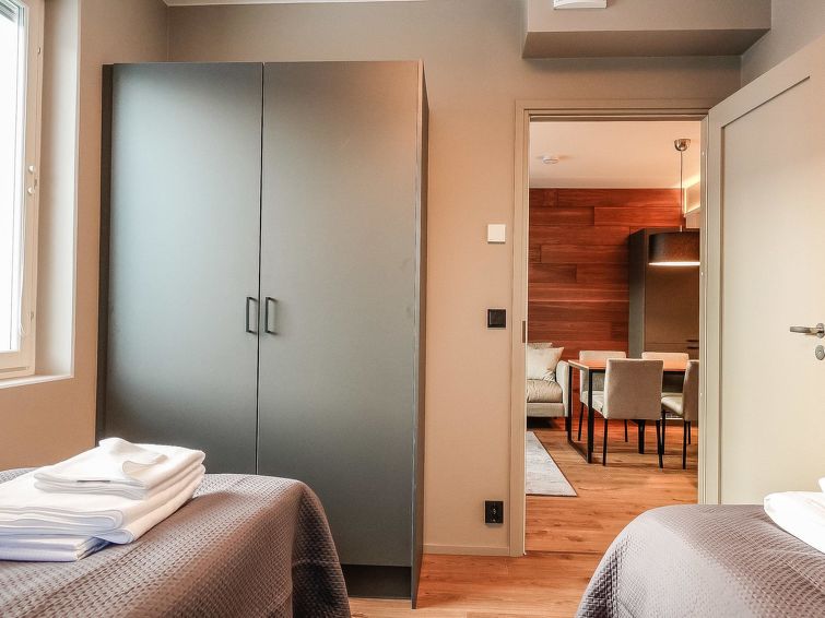 Living room/kitchen, bedroom with double bed (width 200 cm), another bedroom with two separate beds, sauna, washroom/WC and glazed balcony. Separate WC. The sofa in living room can be used as an extra bed. Electric fireplace. Storage space in the basement (shared use).