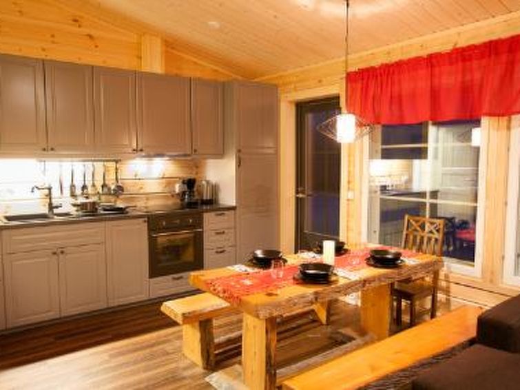Stylish and spacious apartment in a quiet location by the lake, traditional Lappish village landscape. Due to location and large north-facing windows, apartment is the ideal place for northern lights to see. At south direction shines the Levi tourist center lights.