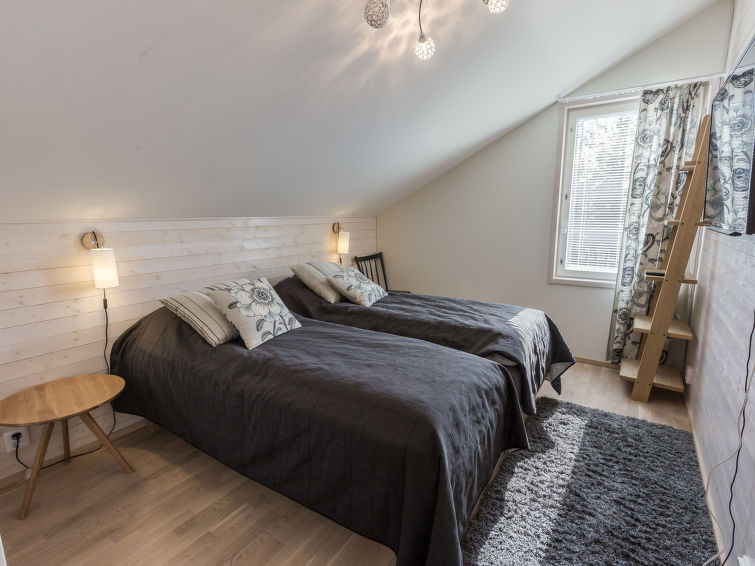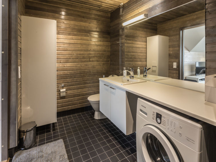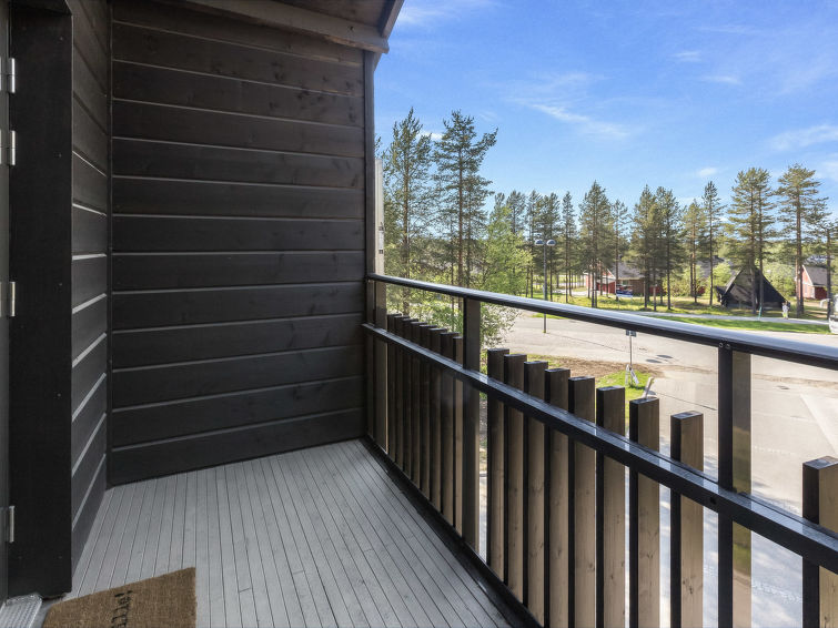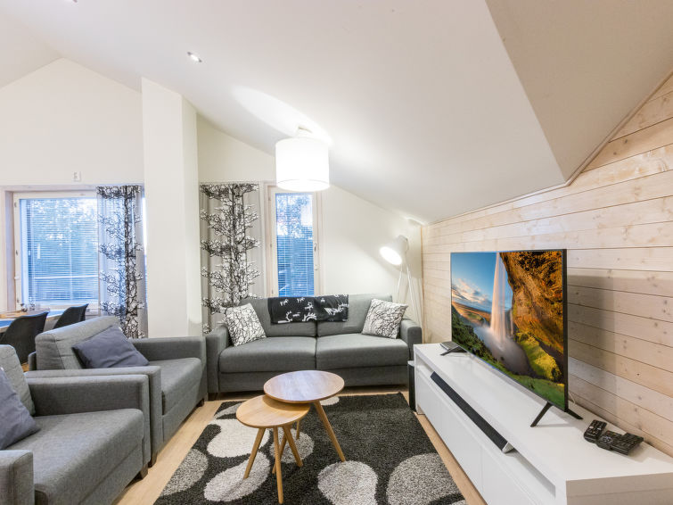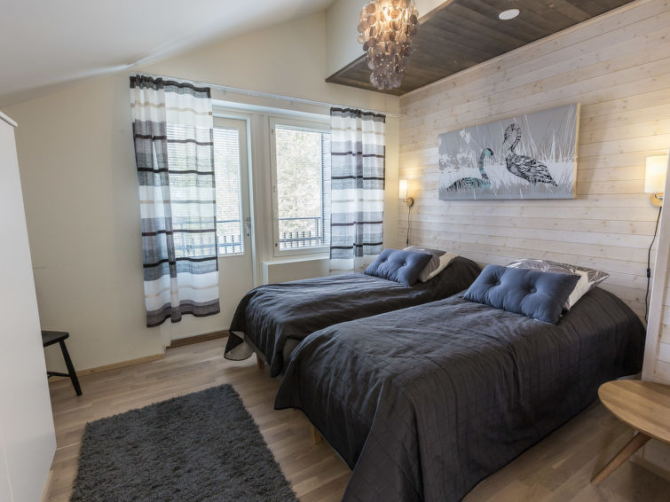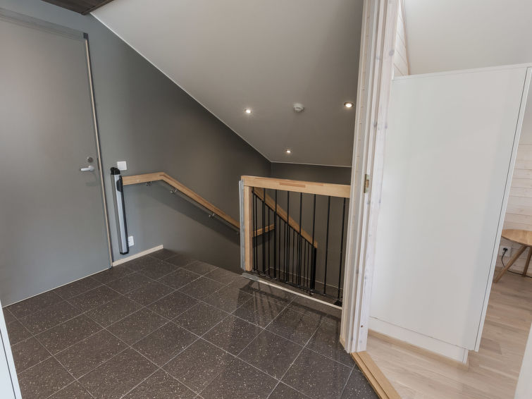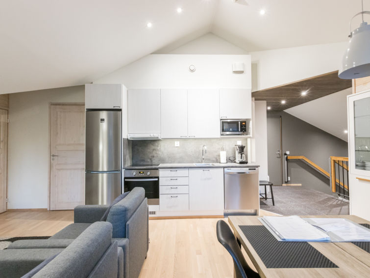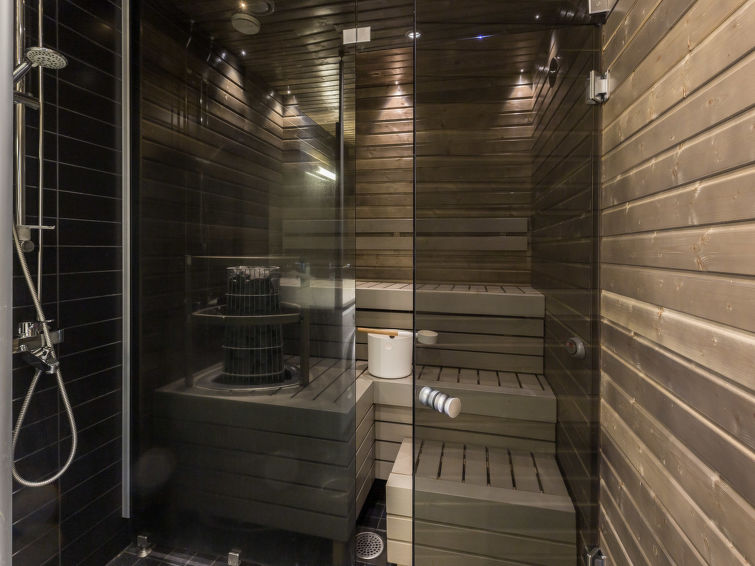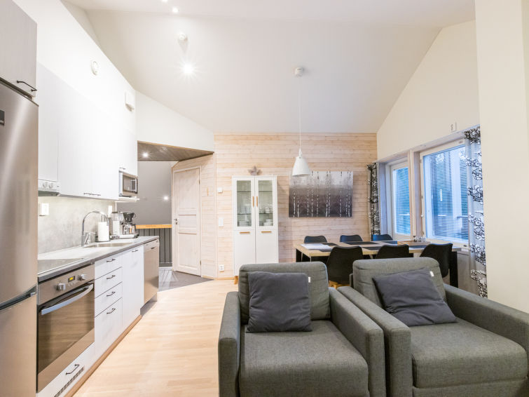 A beautiful lost-style apartment in the heart of Levi. All services of Levi from ski slopes and cross-country skiing tracks to outdoor trails and shops, cafes and restaurants are within walking distance. No need for your own car while staying in Levin Stara. The light and spacious apartment has two balconies so there is possibility to enjoy the rays on sunshine around the clock. The apartment can be connected with the neighbour apartment Levin Stara A10 (15286) which allows a bigger group to enjoy their holiday together. The apartment has two bedrooms with two beds each. The bright living room also has a fold-out couch (width 165 cm). Kitchenette brings more living space and big dining table enables the whole group to dine together. Stylish sauna, bathroom and toilet are combined in one space (on the contrary than in the floor plan). The apartment is well equipped including two Smart-TVs, DVD/Bluray, home theater with bluetooth and free Wifi.