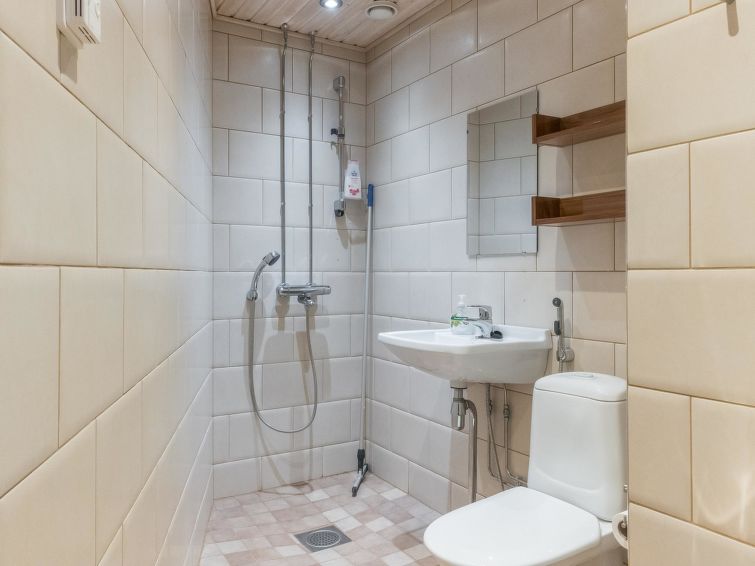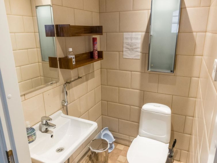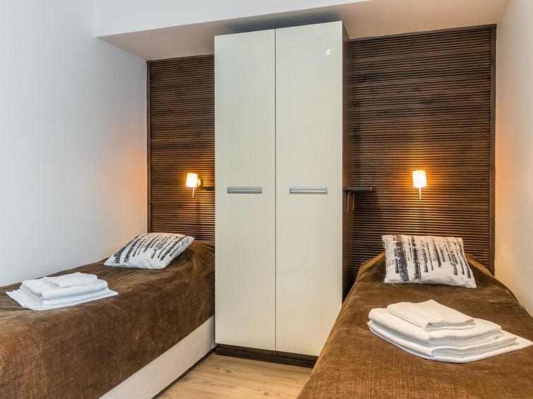 Downstairs living room, kitchen, bedroom with two beds and little desktop, WC with shower and separate WC. Balconies in the living room and kitchen, living room balcony on the side of the slope.