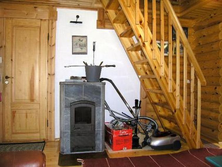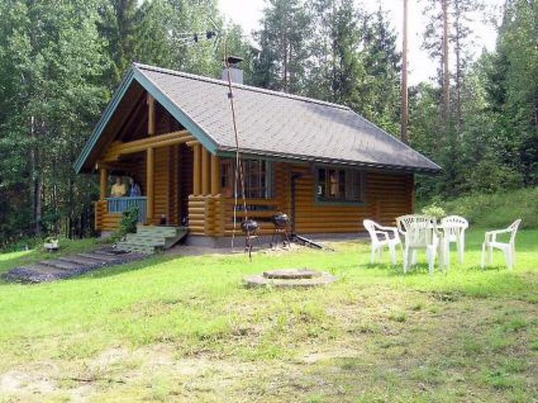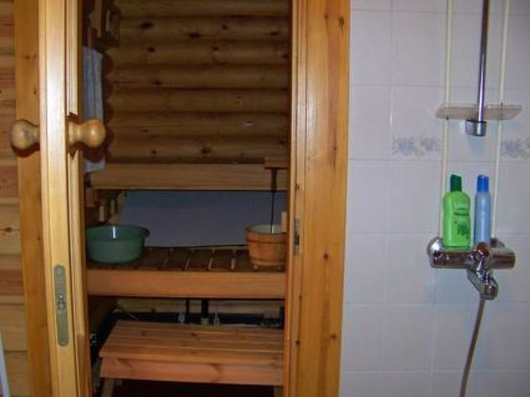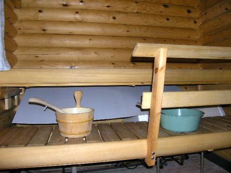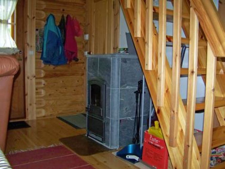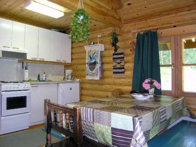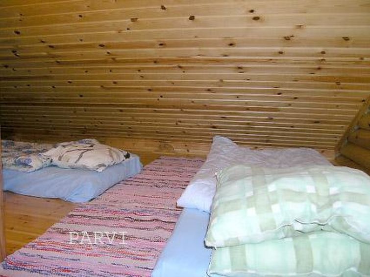 Log cottage 1996, livingroom/kitchen, sleeping alcove with 120 cm wide bed, loft (19 m²) with 2 mattresses, wash room, sauna (elect.stove) and terrace.