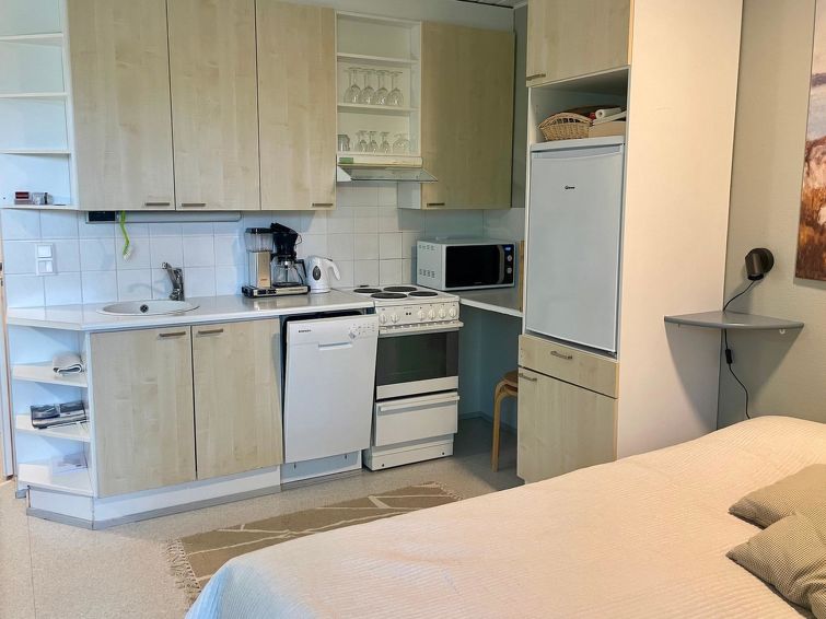 77 km north of Joensuu, Pond Käränkälampi 180 m (length 2 km, width 1,5 km). Wooden row house flat, renovated 1990, kitchen-living room with double bed and convertible sofa, washroom, sauna (elec. stove), small terrace. There is air cooler. Cozy, small row house apartment in Loma-Koli cottage area. Distance to the common beach by pond Käränkälampi 180 m. The flat is situated near skiing tracks, distance to the illuminated track only 50 m. The flat is suitable for downhill and cross-country skiers; Ukko-Koli slopes 9 km. Reservations start at 16.00 and end at 12.00 ( also in weekend bookings). the Final cleaning will be added to the price during 27.12.-12.1 and Midsummer.