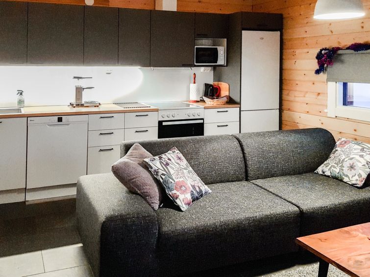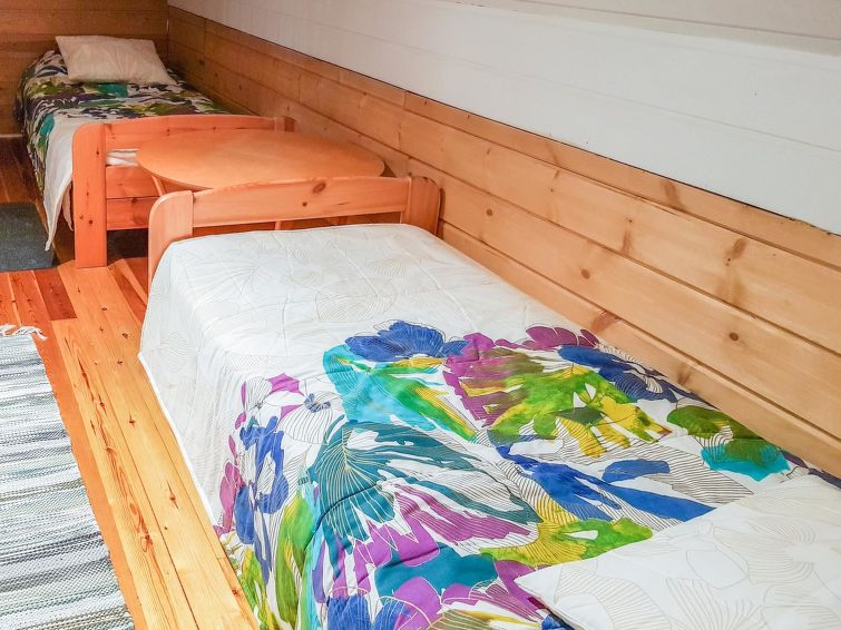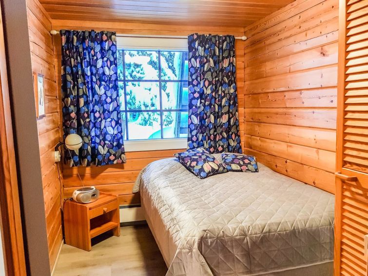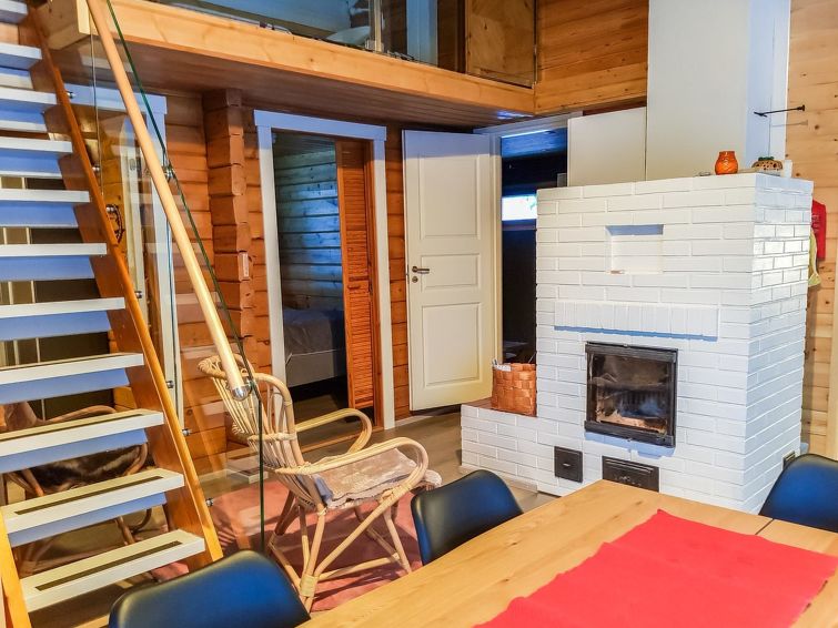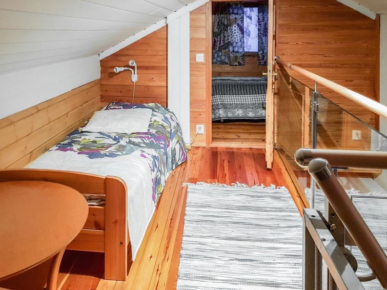 Log cottage built in 1988, renovated in 2021, bedroom 1: double bed, bedroom 2: 120 cm wide bed, loft: 2 beds, alcove (with window and door) on the loft: 1 bed, living room, kitchen, electric sauna. Downstairs 66 m², loft 26 m² (less than 160 cm hight, partly sloping ceilings). Cottage is located on the slope and stairs leads to the front door (see the photos). Between the cottage and the lake there is Tahkolanrannantie-road.